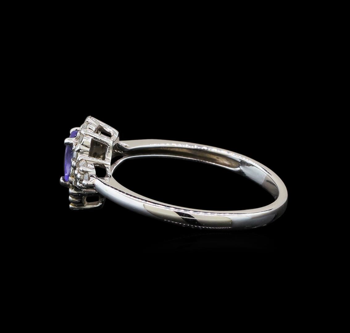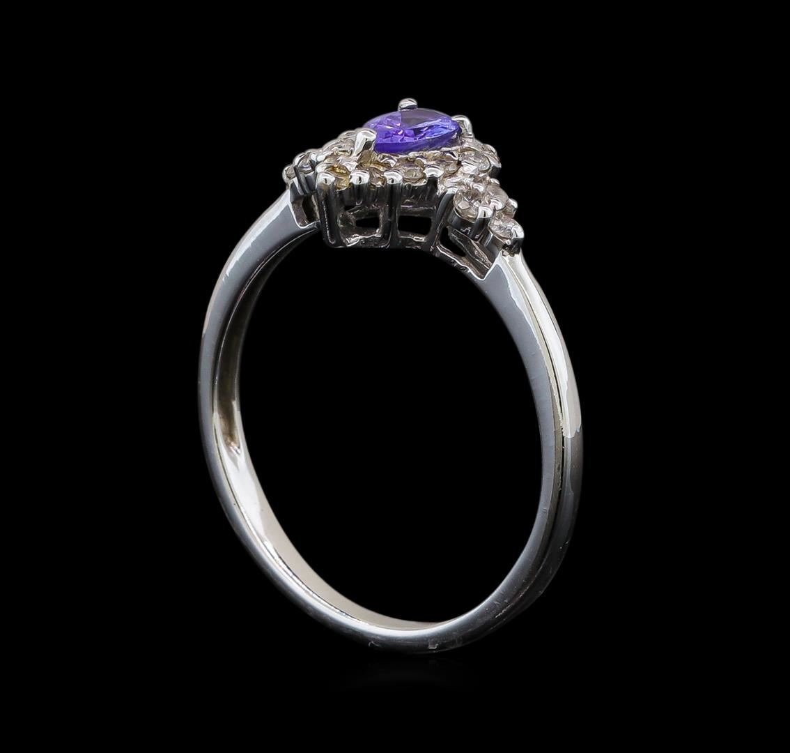 One electronically tested 14KT white gold ladies cast tanzanite and diamond ring with a bright polish finish. Identified with markings of "14K". Condition is new. Containing: One prong set pear modified brilliant cut natural tanzanite, measuring 5.50 x 3.80 x 2.47mm, approximate weight of 0.35ct., clarity is eye clean, type I, medium light, slightly grayish, violet color, (GIA V 4/2), cut is good. Nineteen prong set round brilliant cut diamonds, measuring 1.30 - 1.30 x 0.78mm (depth est.) approximate total weight of 19 Stones = 0.15ct. Clarity: I-1 to I-3. Color: I - J. Colored gemstones are presumed to have been subjected to commonly used enhancement processes. All diamonds and colored gemstones are graded in the mounting, unless otherwise stated. Total Weight of Colored Stones 0.35ct. Total Weight of Diamonds 0.15ct. Total Weight of Ring 2.40 grams. GGL Appraised at $1,120.00.