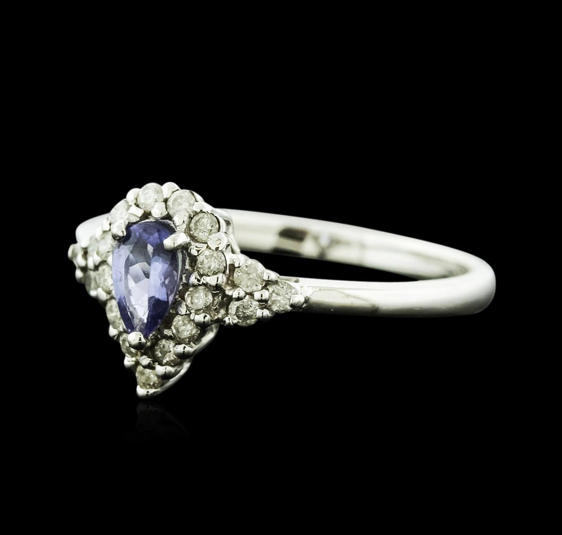 One electronically tested 14KT white gold ladies cast tanzanite and diamond ring with a bright polish finish. Identified with markings of "14K". Condition is new. Containing: One prong set pear modified brilliant cut natural tanzanite, measuring 5.50 x 3.80 x 2.47mm, approximate weight of 0.35ct., clarity is eye clean, type I, medium light, slightly grayish, violet color, (GIA V 4/2), cut is good. Nineteen prong set round brilliant cut diamonds, measuring 1.30 - 1.30 x 0.78mm (depth est.) approximate total weight of 19 Stones = 0.15ct. Clarity: I-1 to I-3. Color: I - J. Colored gemstones are presumed to have been subjected to commonly used enhancement processes. All diamonds and colored gemstones are graded in the mounting, unless otherwise stated. Total Weight of Colored Stones 0.35ct. Total Weight of Diamonds 0.15ct. Total Weight of Ring 2.40 grams. GGL Appraised at $1,120.00.