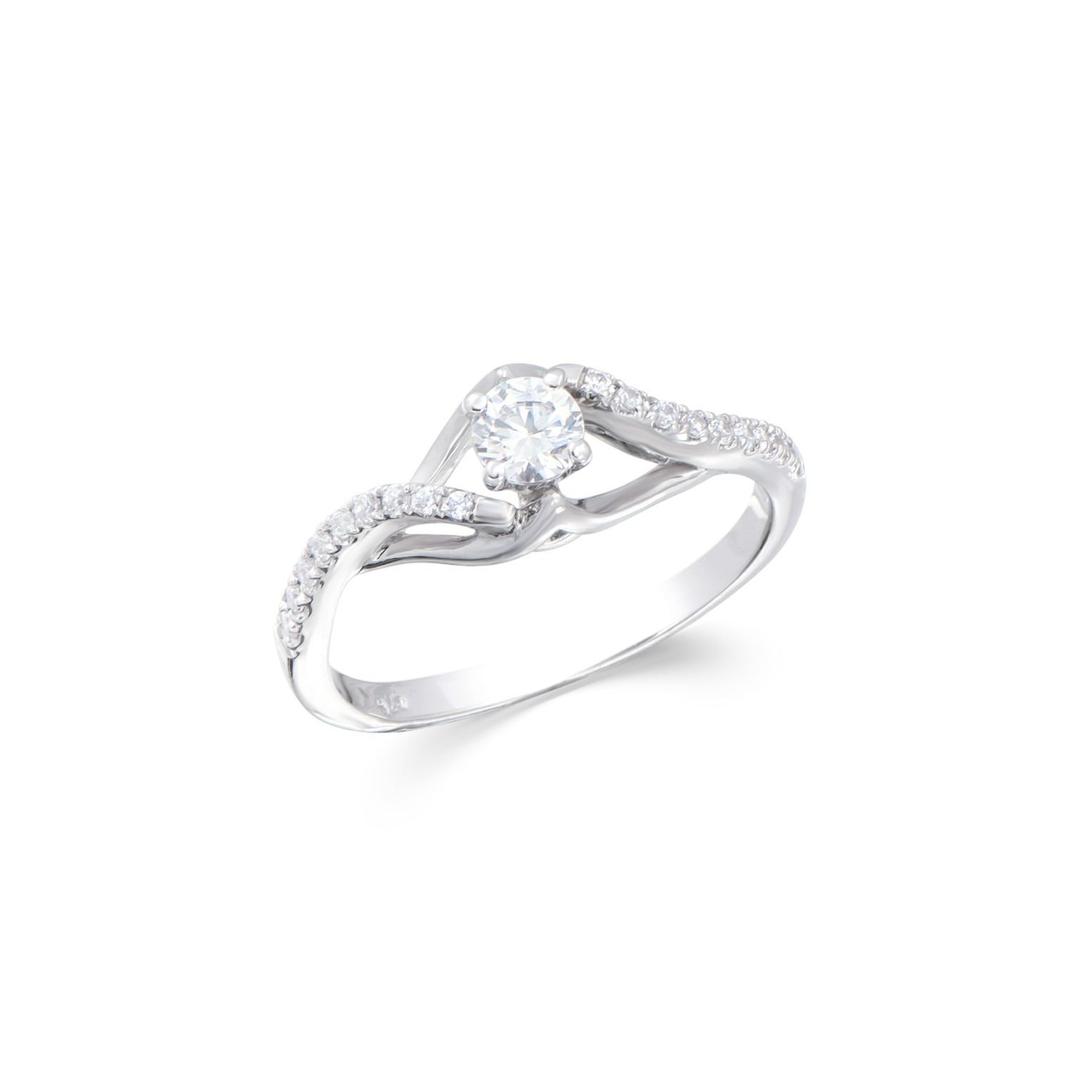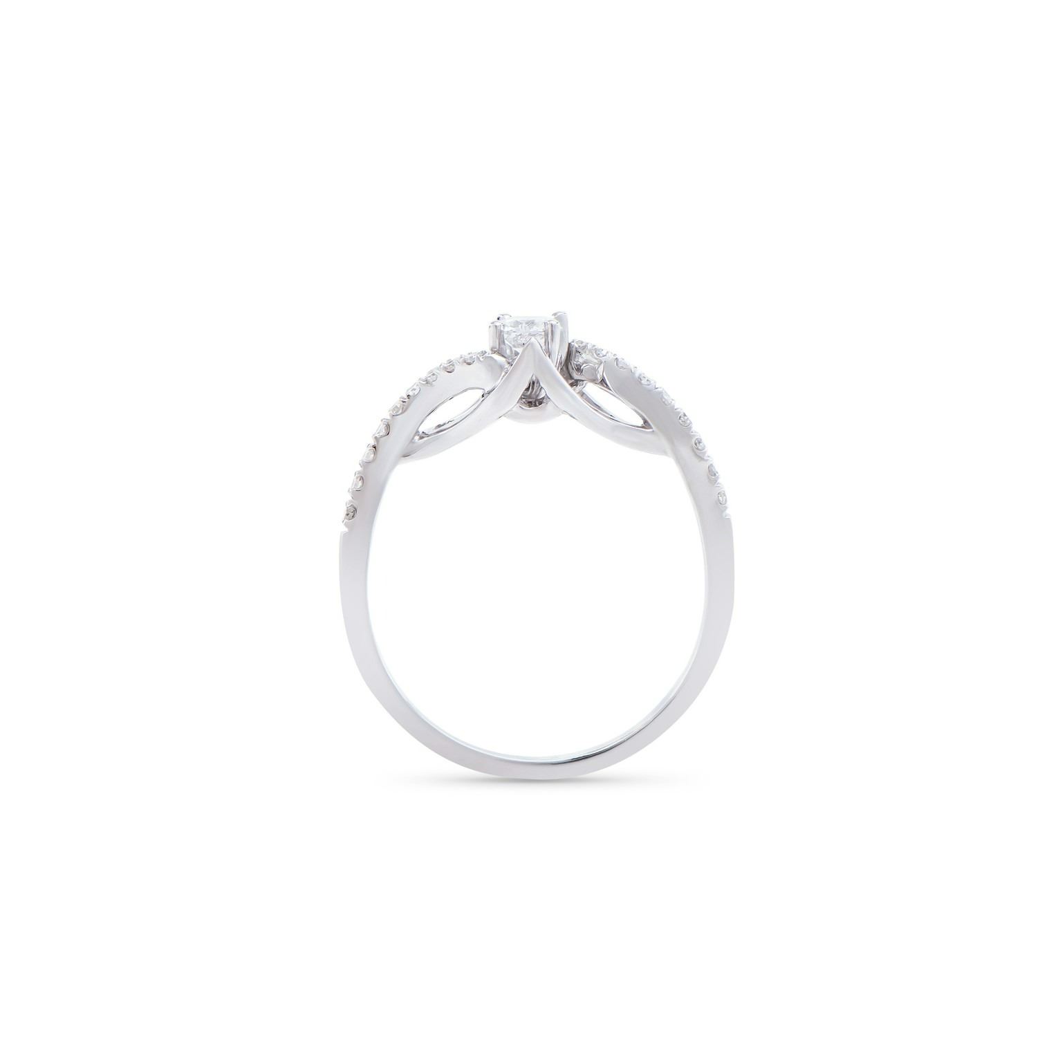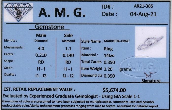 (1) round Diamond with a total weight of 0.21cts with a color of H-I and clarity of I1-I2. (18) round Diamonds with a total weight of 0.14cts with a color of H-I and clarity of I1-I2. Total weight of this ring is 2.20 grams. Ring size is 7.5.