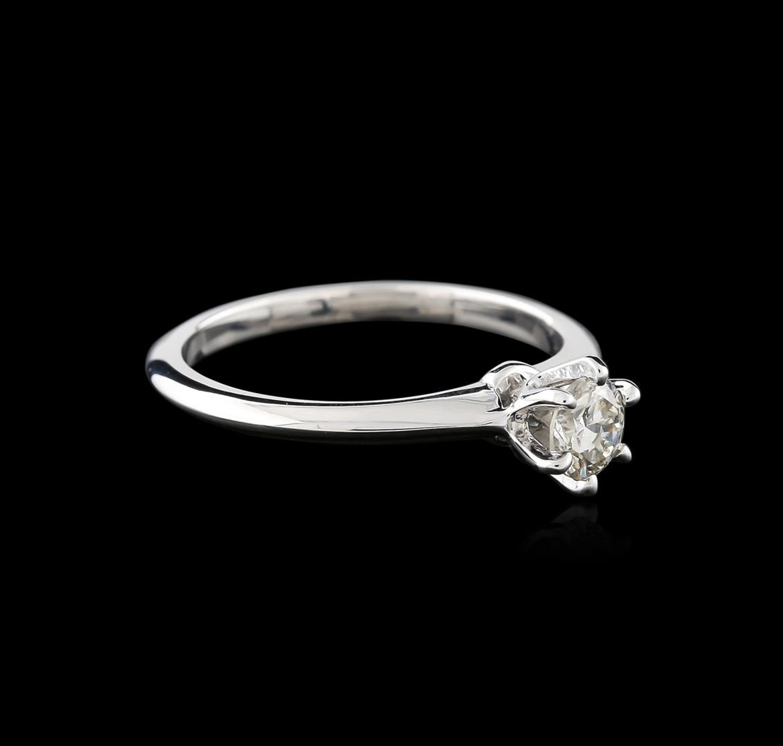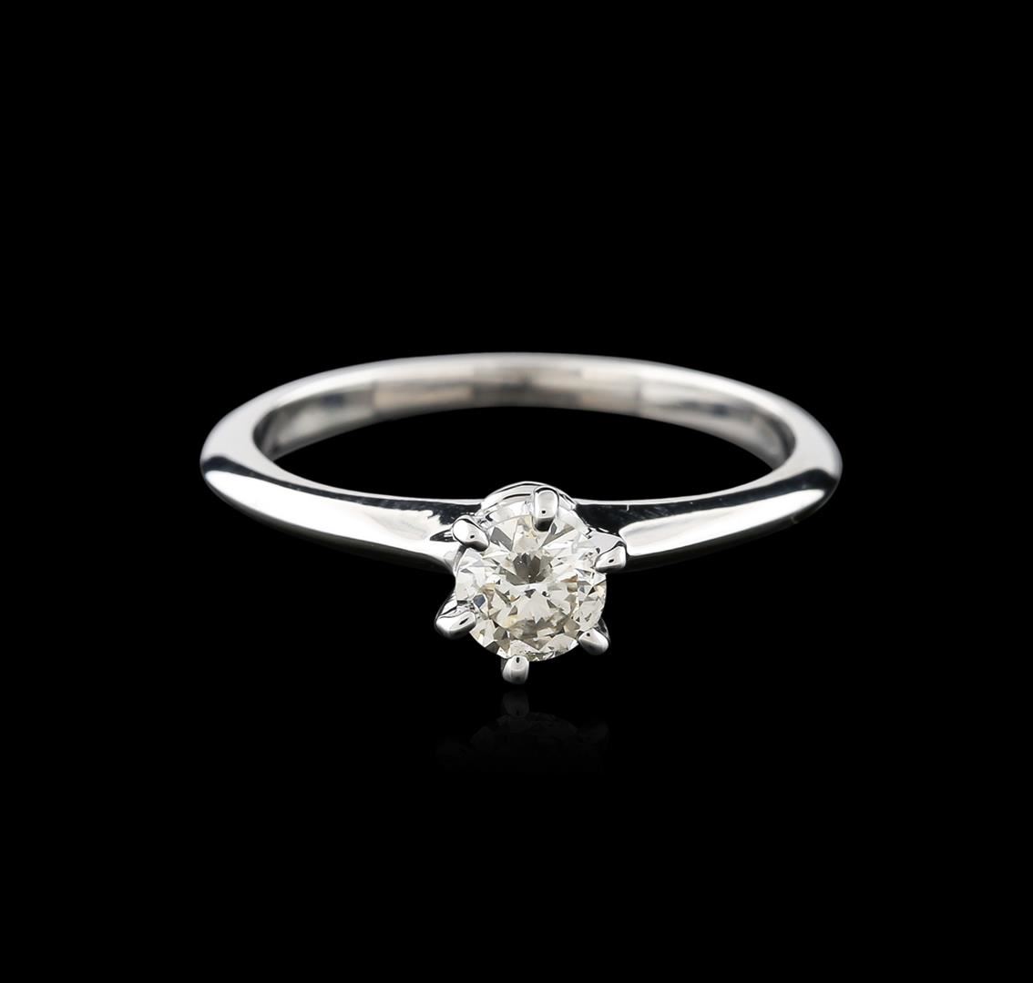 One electronically tested 14KT white gold ladies cast diamond solitaire ring with a knife edge shank with a bright polish finish. Identified with markings of "14K". Condition is new. Containing: One prong set round brilliant cut diamond, measuring 4.90 - 4.60 x 2.85mm (depth est.) exact weight 0.37ct. Clarity: SI-2. Color: K, Cut is Good. Diamonds are graded in the mounting, unless otherwise stated. Total Weight of Diamonds 0.37ct. Total Weight of Solitaire Ring 2.20 grams. GGL Appraised at $1,360.00.