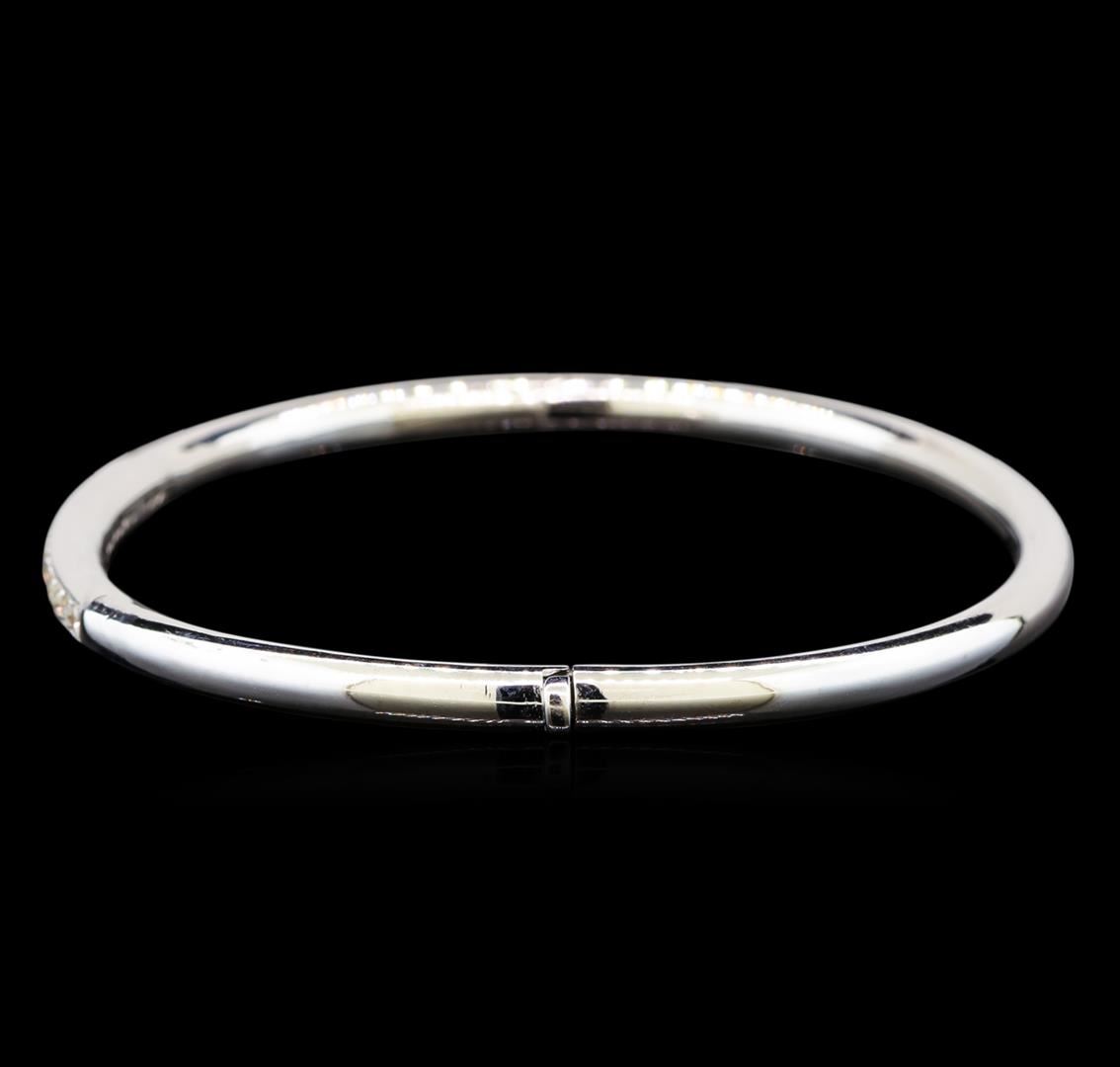 One electronically tested 14KT white gold ladies cast diamond bangle bracelet with a hidden box clasp with a bright polish finish. Identified with markings of "14K". Condition is new. Containing: Fourteen prong set round brilliant cut diamonds, measuring 1.90 - 1.90 x 1.14mm (depth est.) approximate total weight of 14 Stones = 0.39ct. Clarity: SI-1 to SI-2. Color: I - J, Cut is Good. All diamonds are graded in the mounting, unless otherwise stated. Total Weight of Diamonds 0.39ct. Total Weight of Bangle Bracelet 7.80 grams. GGL Appraised at $1,885.00.
