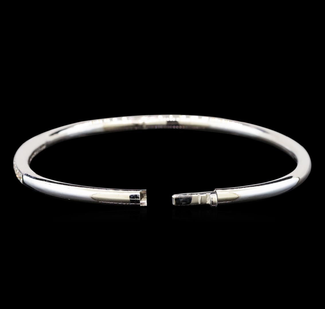 One electronically tested 14KT white gold ladies cast diamond bangle bracelet with a hidden box clasp with a bright polish finish. Identified with markings of "14K". Condition is new. Containing: Fourteen prong set round brilliant cut diamonds, measuring 1.90 - 1.90 x 1.14mm (depth est.) approximate total weight of 14 Stones = 0.39ct. Clarity: SI-1 to SI-2. Color: I - J, Cut is Good. All diamonds are graded in the mounting, unless otherwise stated. Total Weight of Diamonds 0.39ct. Total Weight of Bangle Bracelet 7.80 grams. GGL Appraised at $1,885.00.