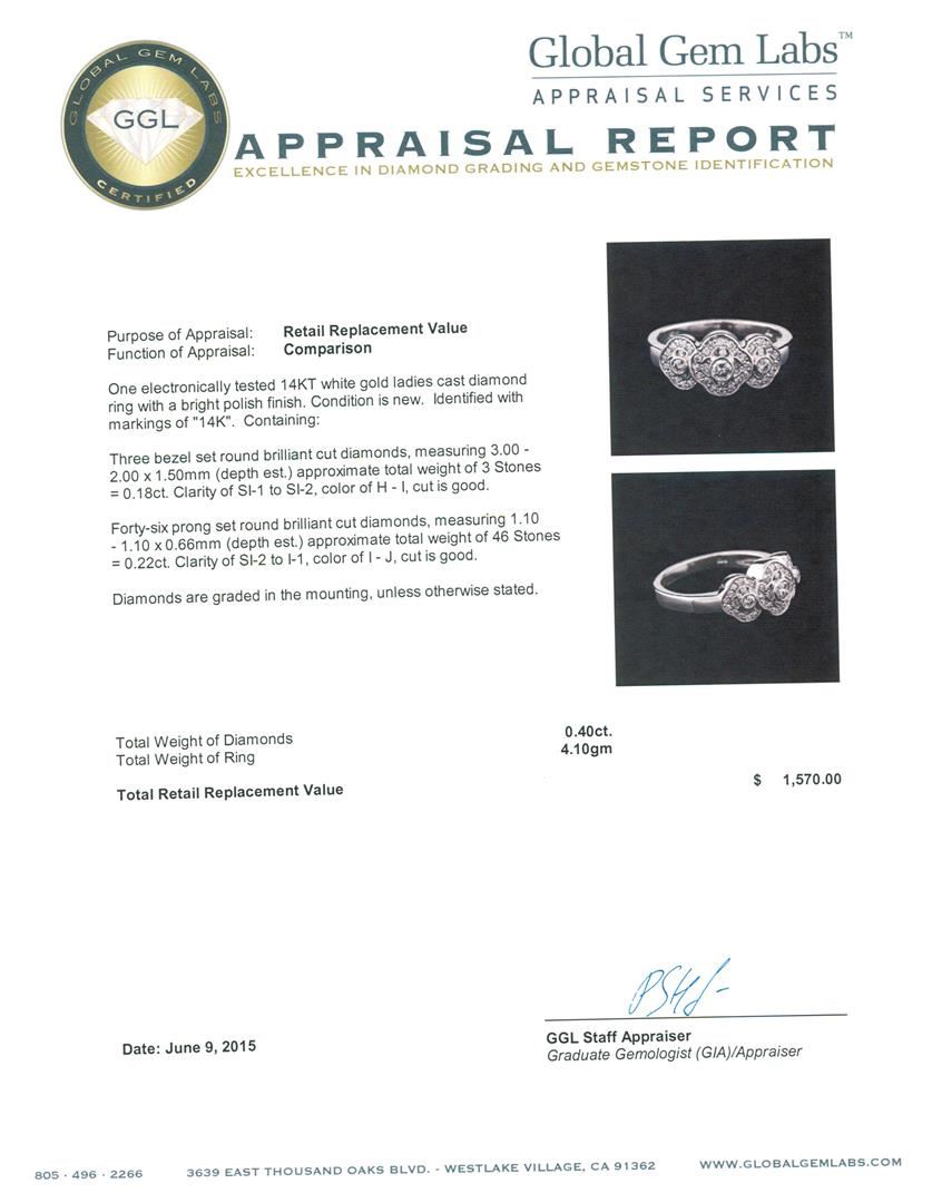 One electronically tested 14KT white gold ladies cast diamond ring with a bright polish finish. Identified with markings of "14K". Condition is new. Containing: Three bezel set round brilliant cut diamonds, measuring 3.00 - 2.00 x 1.50mm (depth est.) approximate total weight of 3 Stones = 0.18ct. Clarity: SI-1 to SI-2. Color: H - I, Cut is Good. Forty-Six prong set round brilliant cut diamonds, measuring 1.10 - 1.10 x 0.66mm (depth est.) approximate total weight of 46 Stones = 0.22ct. Clarity: SI-2 to I-1. Color: I - J, Cut is Good. Diamonds are graded in the mounting, unless otherwise stated. Total Weight of Diamonds 0.40ct. Total Weight of Ring 4.10 grams. GGL Appraised.