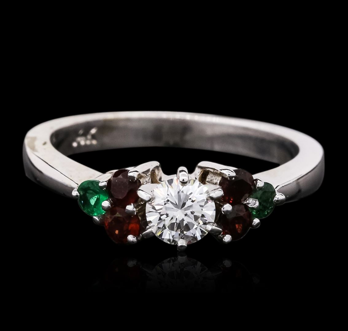 One ring featuring: 14KT white gold weighing 4.50 grams containing one round diamond center stone with a total weight of 0.40ct, four garnets with a total weight of 0.28cts, and two emeralds with a total weight of 0.14cts.