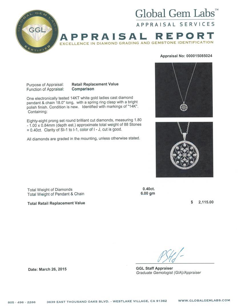 One electronically tested 14KT white gold ladies cast diamond pendant & chain 18.0" long, with a spring ring clasp with a bright polish finish. Identified with markings of "14K". Condition is new. Containing: Eighty-Eight prong set round brilliant cut diamonds, measuring 1.80 - 1.00 x 0.84mm (depth est.) approximate total weight of 88 Stones = 0.40ct. Clarity: SI-1 to I-1. Color: I - J, Cut is Good. All diamonds are graded in the mounting, unless otherwise stated. Total Weight of Diamonds 0.40ct. Total Weight of Pendant & Chain 6.00 grams. GGL Appraised at $2,115.00.