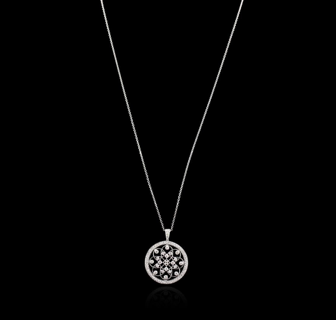 One electronically tested 14KT white gold ladies cast diamond pendant & chain 18.0" long, with a spring ring clasp with a bright polish finish. Identified with markings of "14K". Condition is new. Containing: Eighty-Eight prong set round brilliant cut diamonds, measuring 1.80 - 1.00 x 0.84mm (depth est.) approximate total weight of 88 Stones = 0.40ct. Clarity: SI-1 to I-1. Color: I - J, Cut is Good. All diamonds are graded in the mounting, unless otherwise stated. Total Weight of Diamonds 0.40ct. Total Weight of Pendant & Chain 6.00 grams. GGL Appraised at $2,115.00.