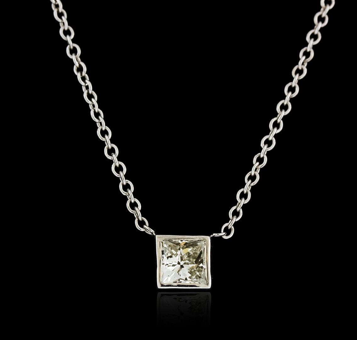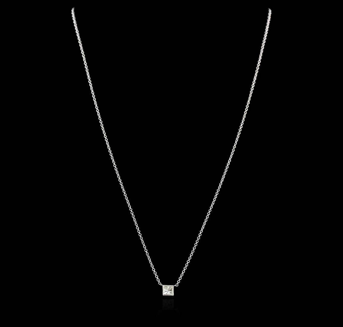 One solitaire necklace featuring: 14KT white gold weighing 2.10 grams containing one bezel set princess cut diamond with a total weight of 0.41ct.