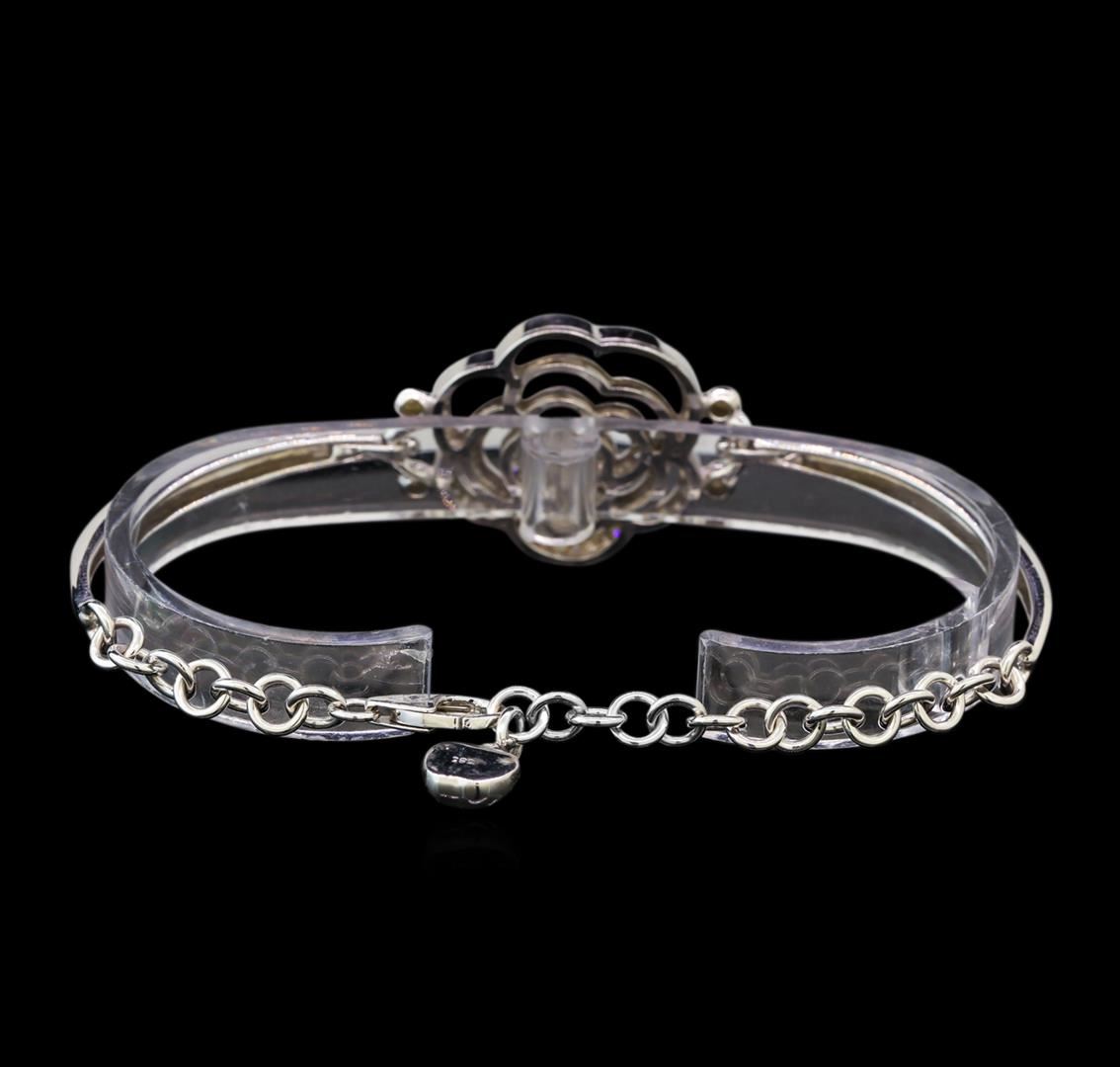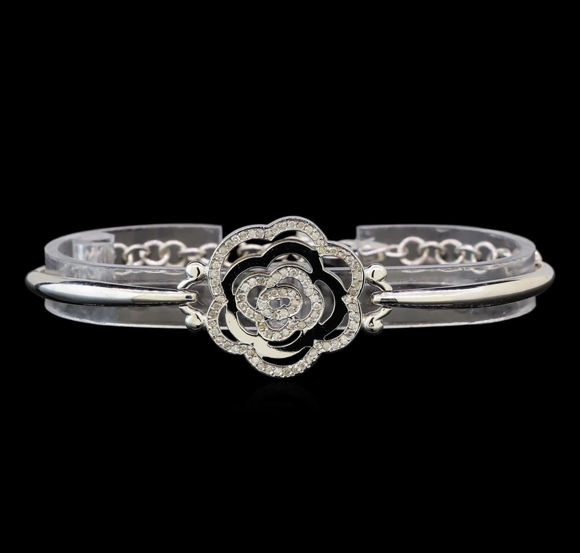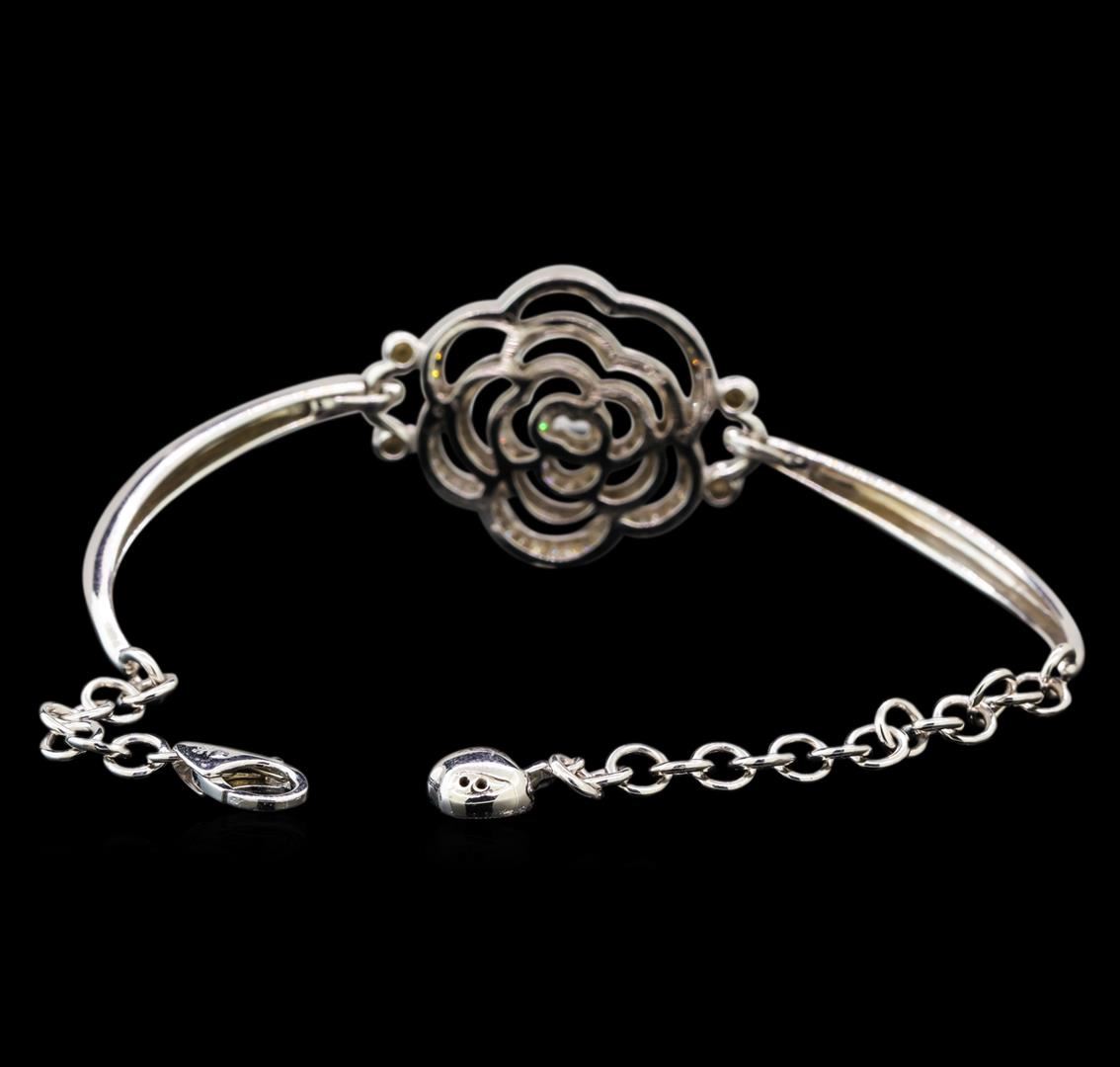 One electronically tested 14KT white gold ladies cast diamond bracelet with a lobster claw clasp with a bright and brushed finish. Measurements: 7.25" in length. Identified with markings of "585". Condition is new. Containing: Ninety prong set round brilliant cut diamonds, measuring 1.10 - 1.10 x 0.66mm (depth est.) approximate total weight of 90 Stones = 0.43ct. Clarity: I-2 to I-3. Color: I - J. All diamonds are graded in the mounting, unless otherwise stated. Total Weight of Diamonds 0.43ct. Total Weight of Bracelet 14.30 grams. GGL Appraised.