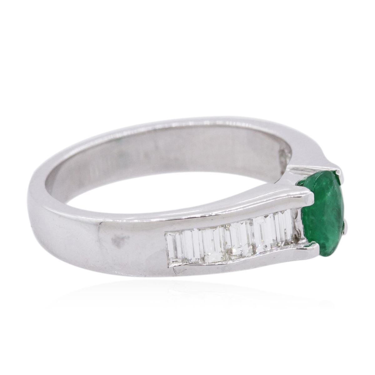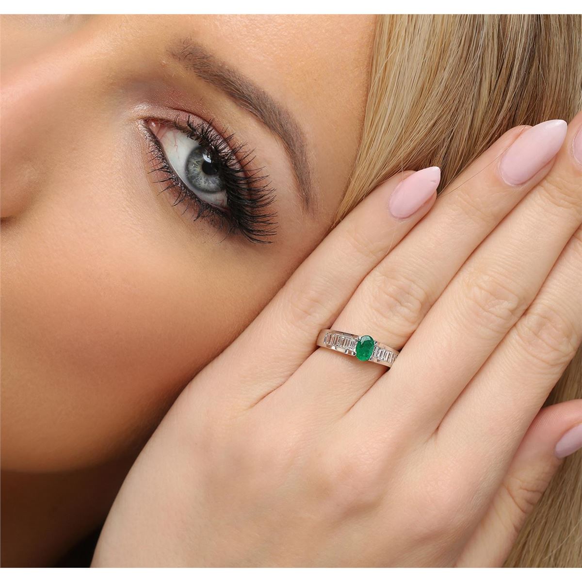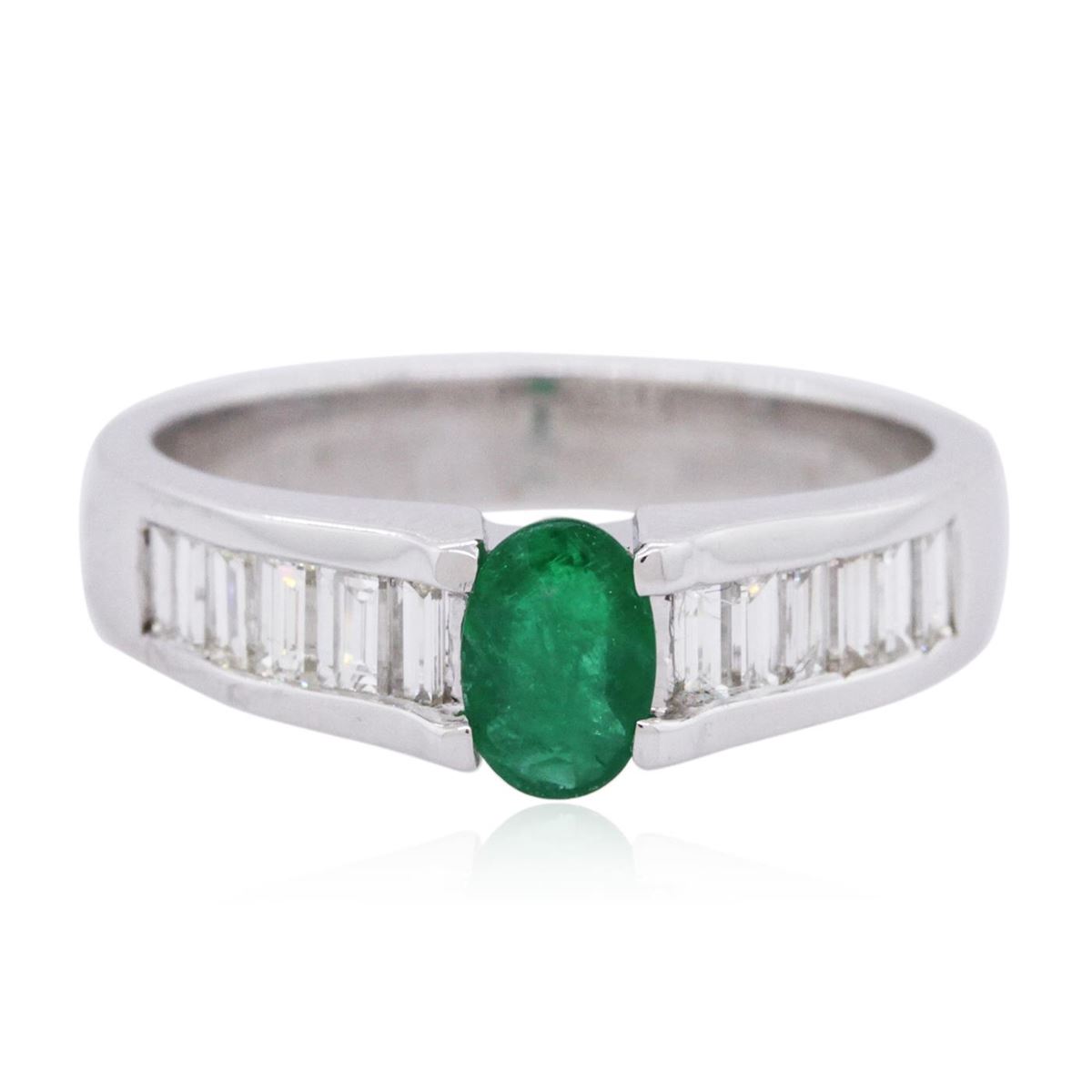 One ring featuring: 14KT white gold weighing 4.40 grams containing one emerald center stone with a total weight of 0.43ct and baguette cut diamonds with a total weight of 0.60cts.