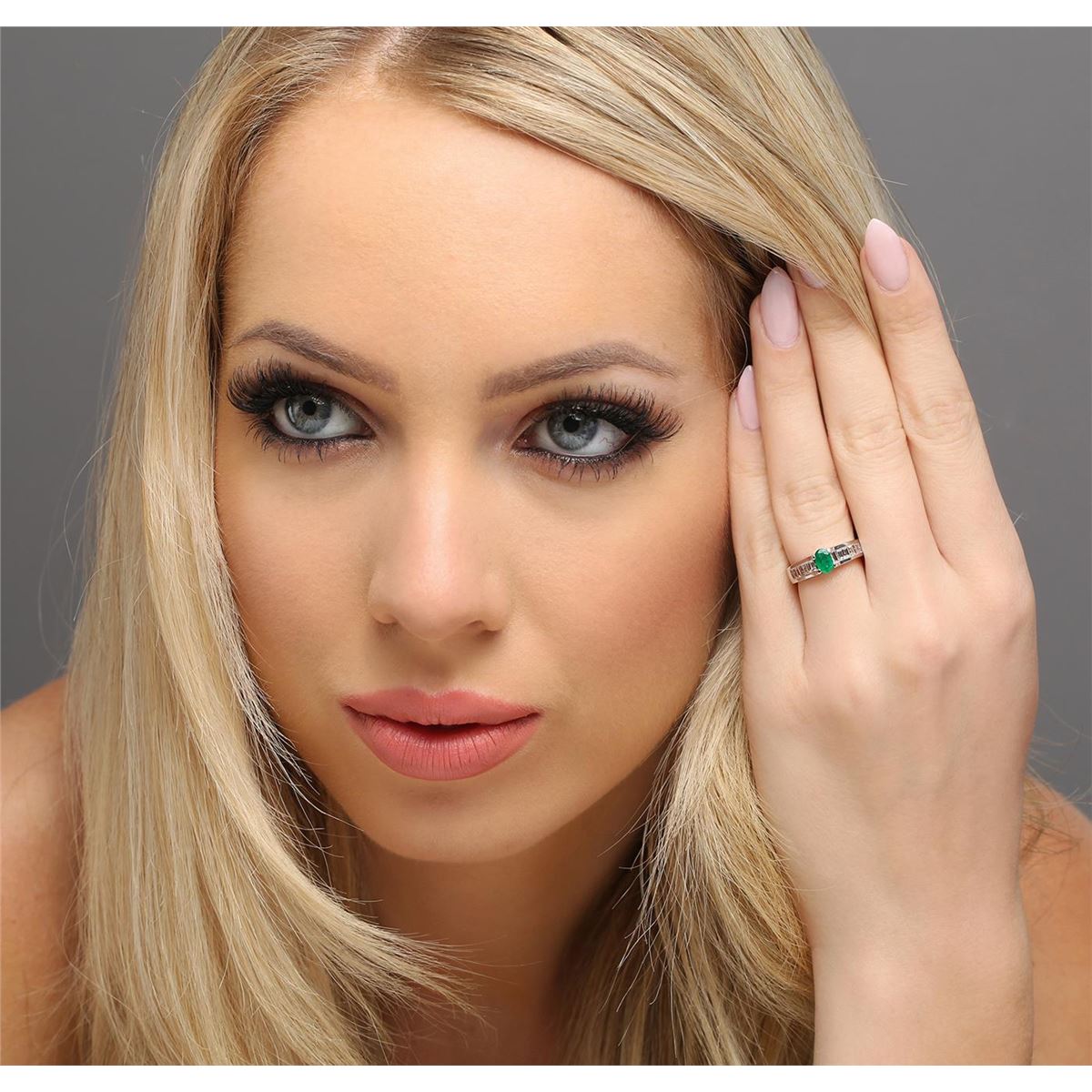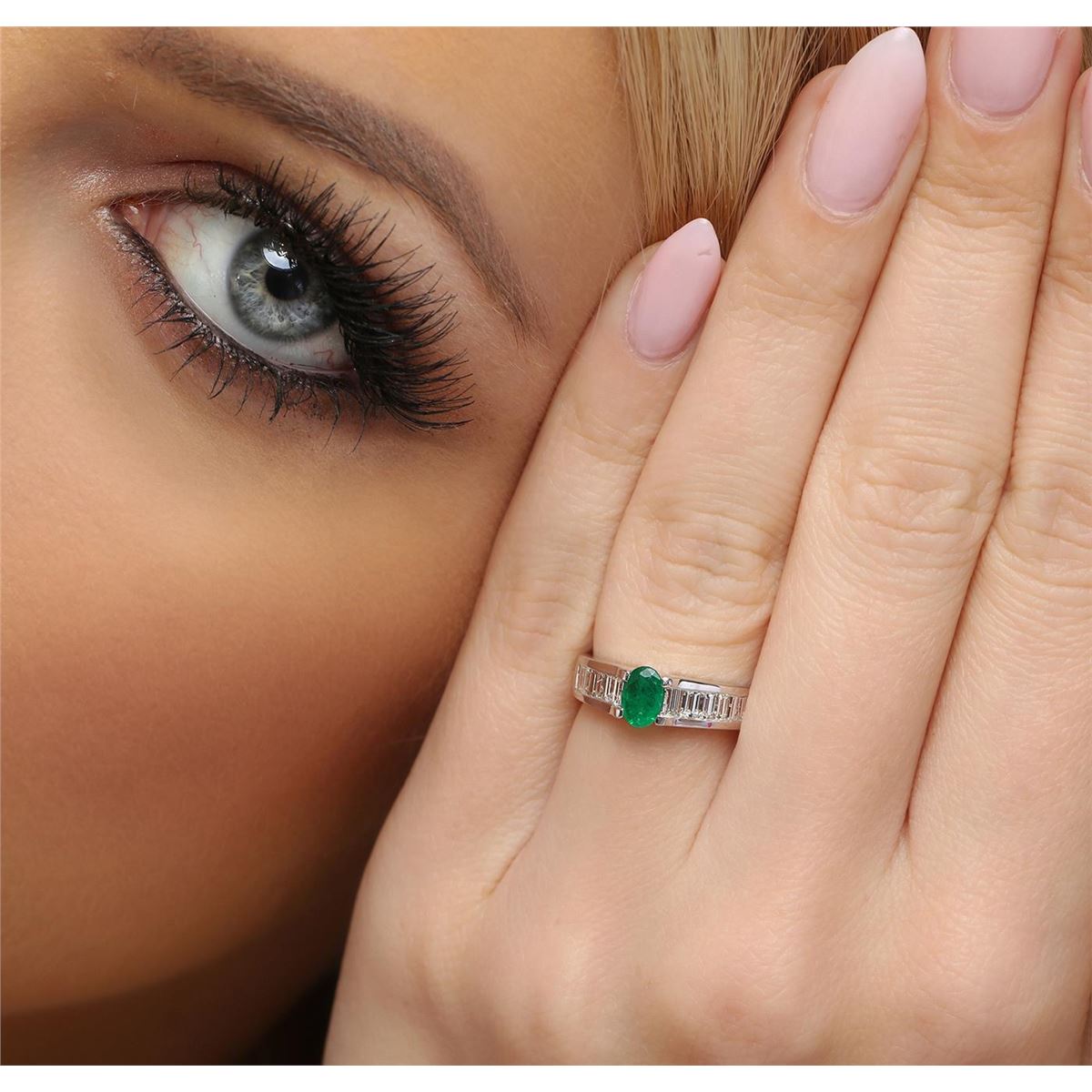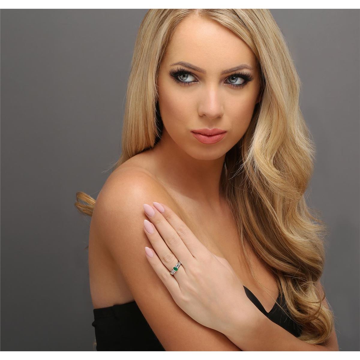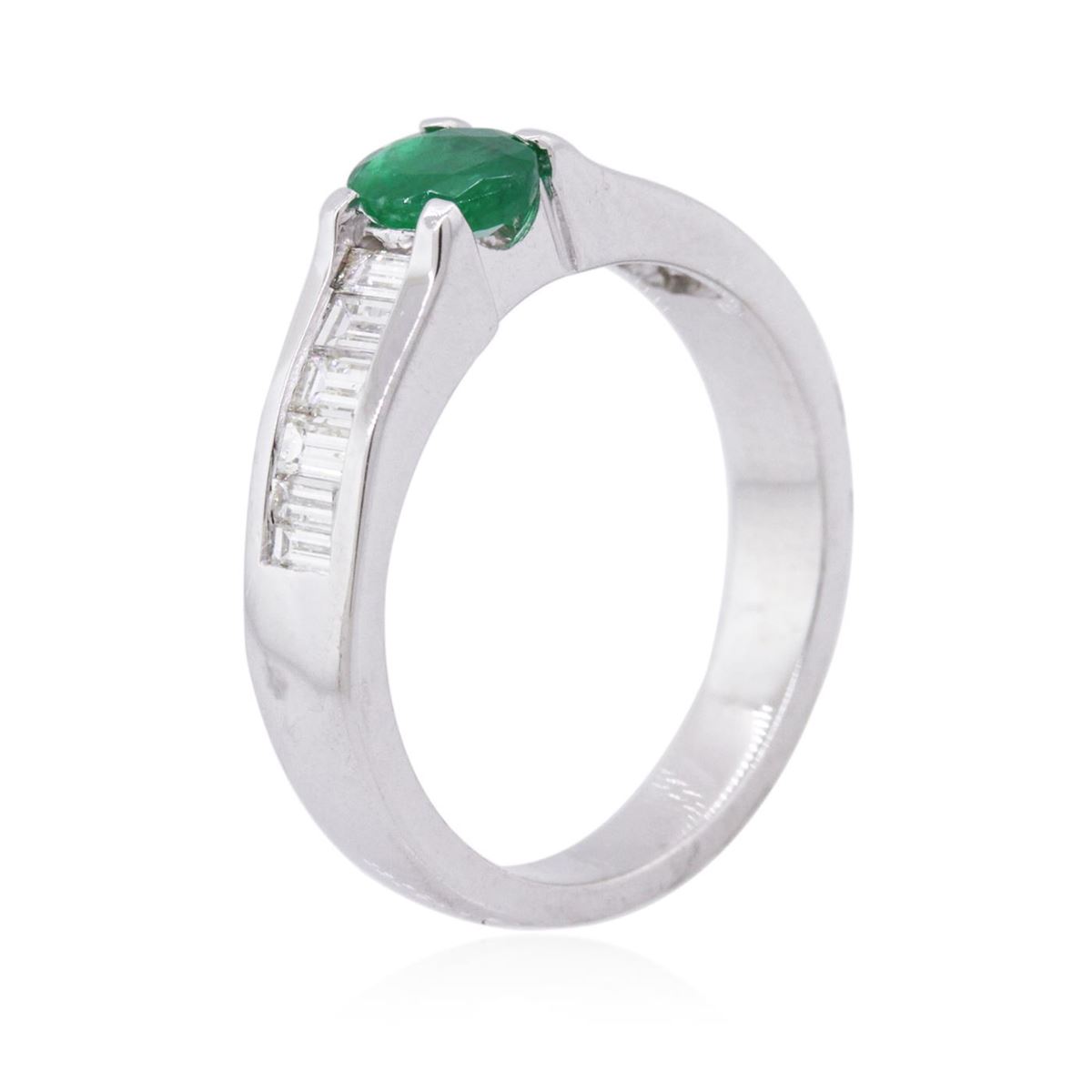 One ring featuring: 14KT white gold weighing 4.40 grams containing one emerald center stone with a total weight of 0.43ct and baguette cut diamonds with a total weight of 0.60cts.