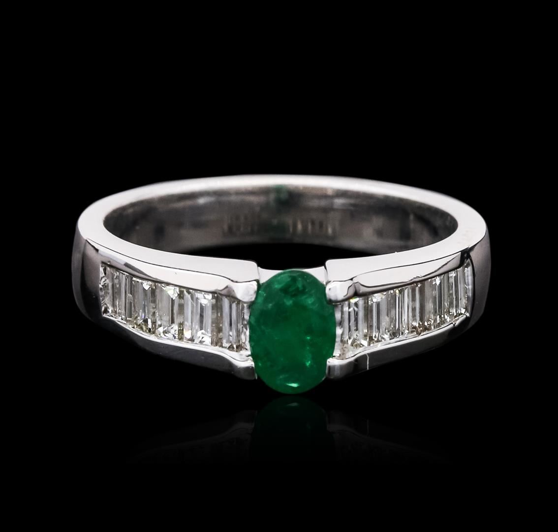One ring featuring: 14KT white gold weighing 4.40 grams containing one emerald center stone with a total weight of 0.43ct and baguette cut diamonds with a total weight of 0.60cts.