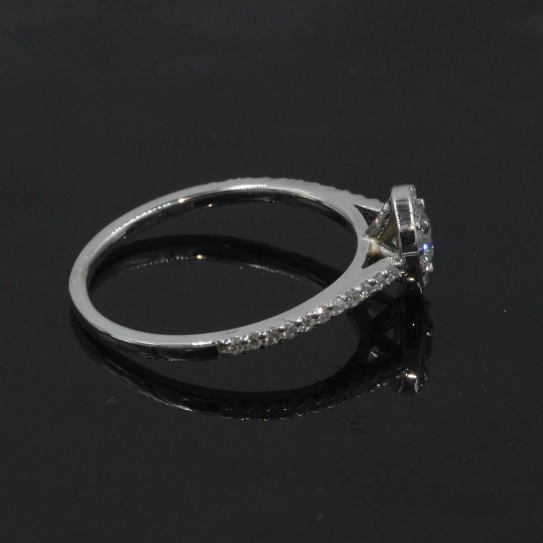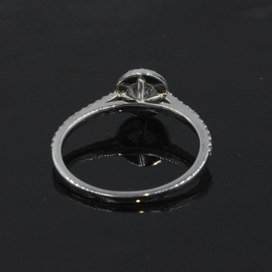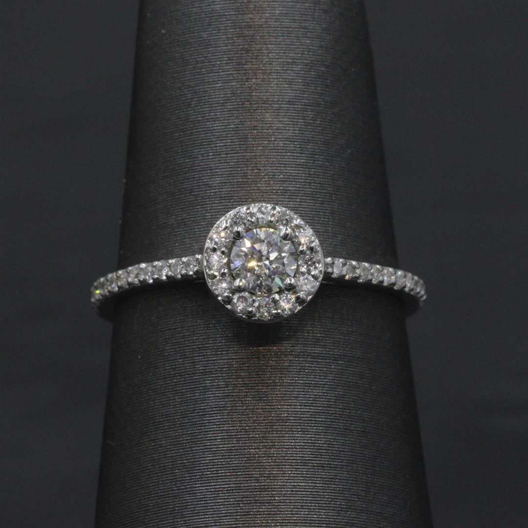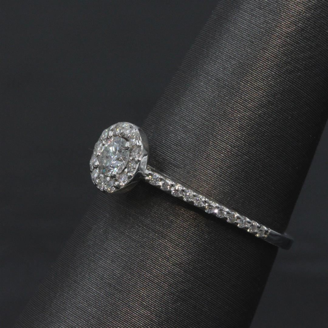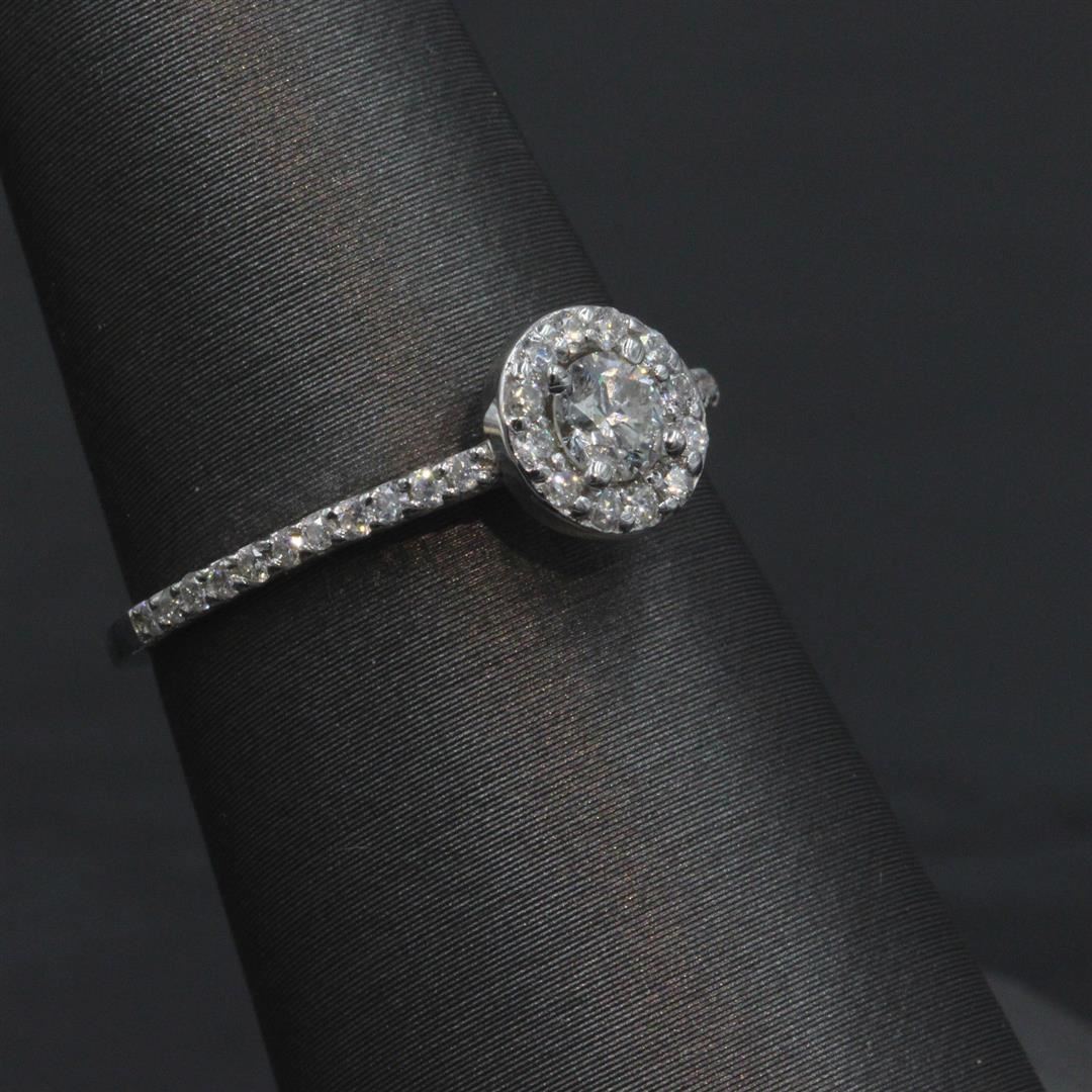 One Round Cut Diamond Solitaire Engagement Ring in 14k White Gold. Setting style is solitaire. Condition is brand new. Gross carat weight is 0.43 carats. Gross gram weight 1.81 grams. Condition is brand new. Main diamond is 0.22 carats, round brilliant cut, color G-H, clarity SI1 - SI2. Side diamond weight is 0.21 carats. Total number of diamonds is 35.