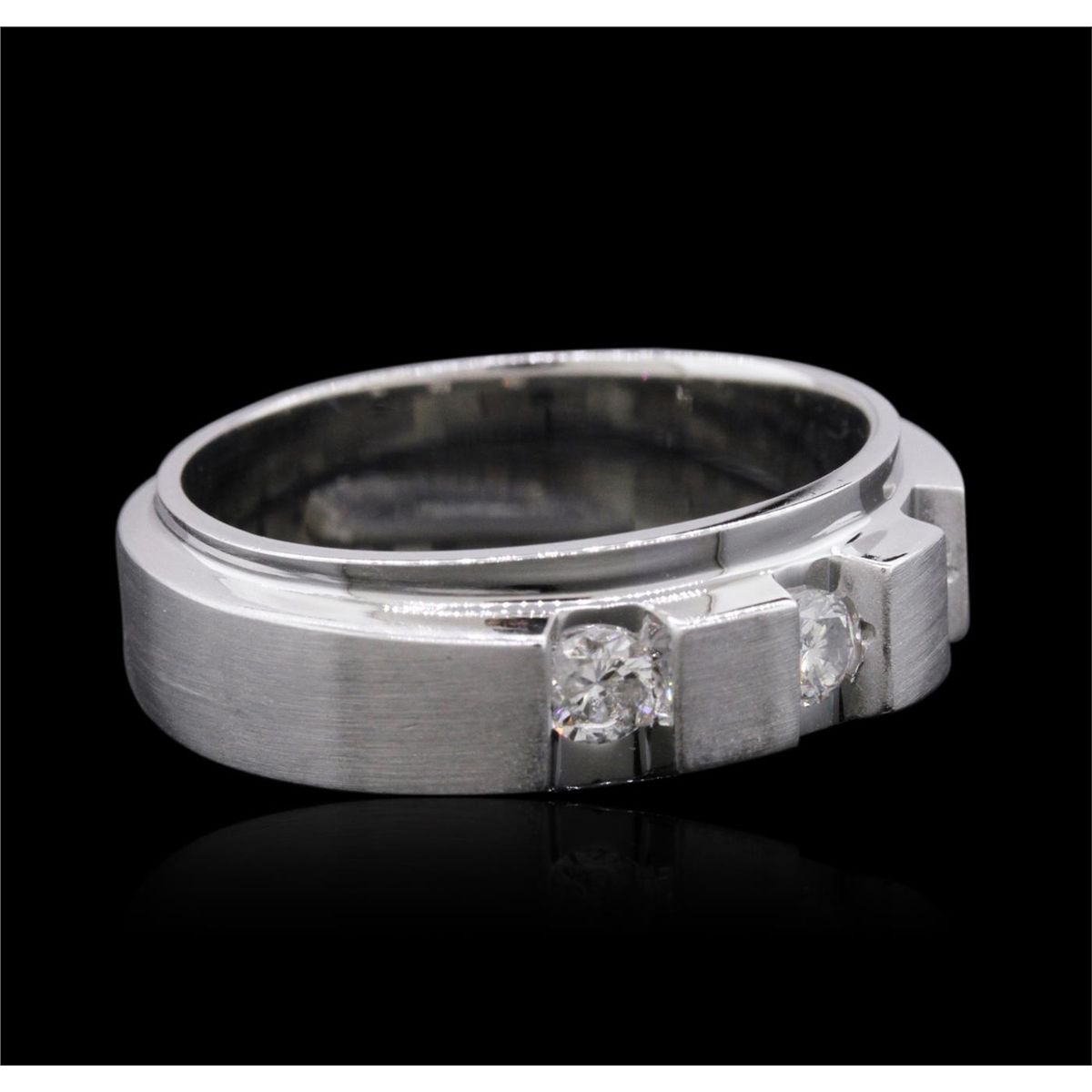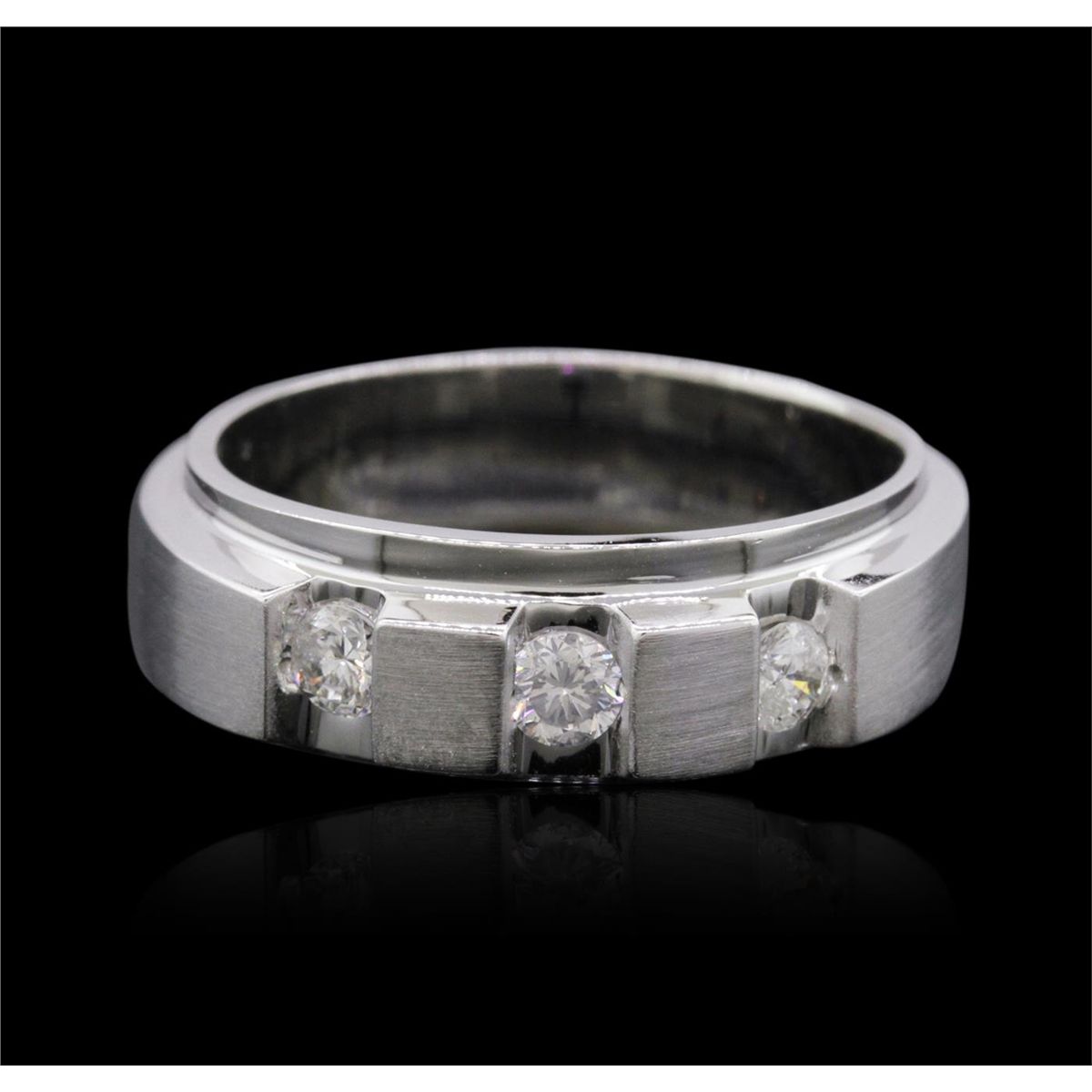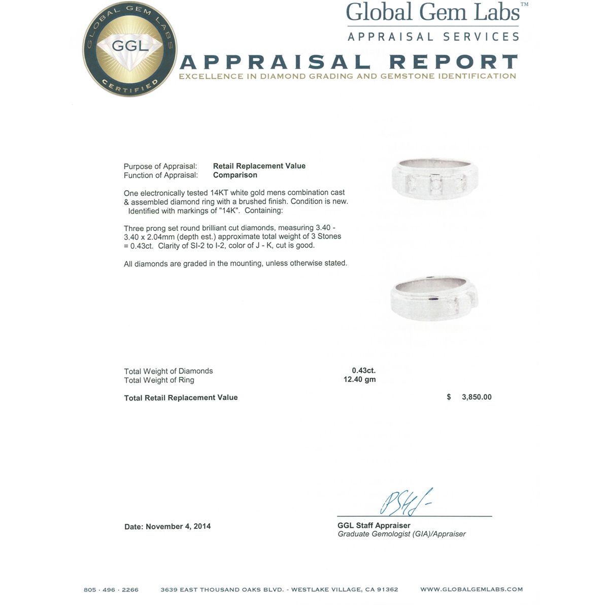 One electronically tested 14KT white gold mens combination cast & assembled diamond ring with a brushed finish. Identified with markings of "14K". Condition is new. Containing: Three prong set round brilliant cut diamonds, measuring 3.40 - 3.40 x 2.04mm (depth est.) approximate total weight of 3 Stones = 0.43ct. Clarity: SI-2 to I-2. Color: J - K, Cut is Good. All diamonds are graded in the mounting, unless otherwise stated. Total Weight of Diamonds 0.43ct. Total Weight of Ring 12.40 grams. GGL Appraised at $3,850.00.