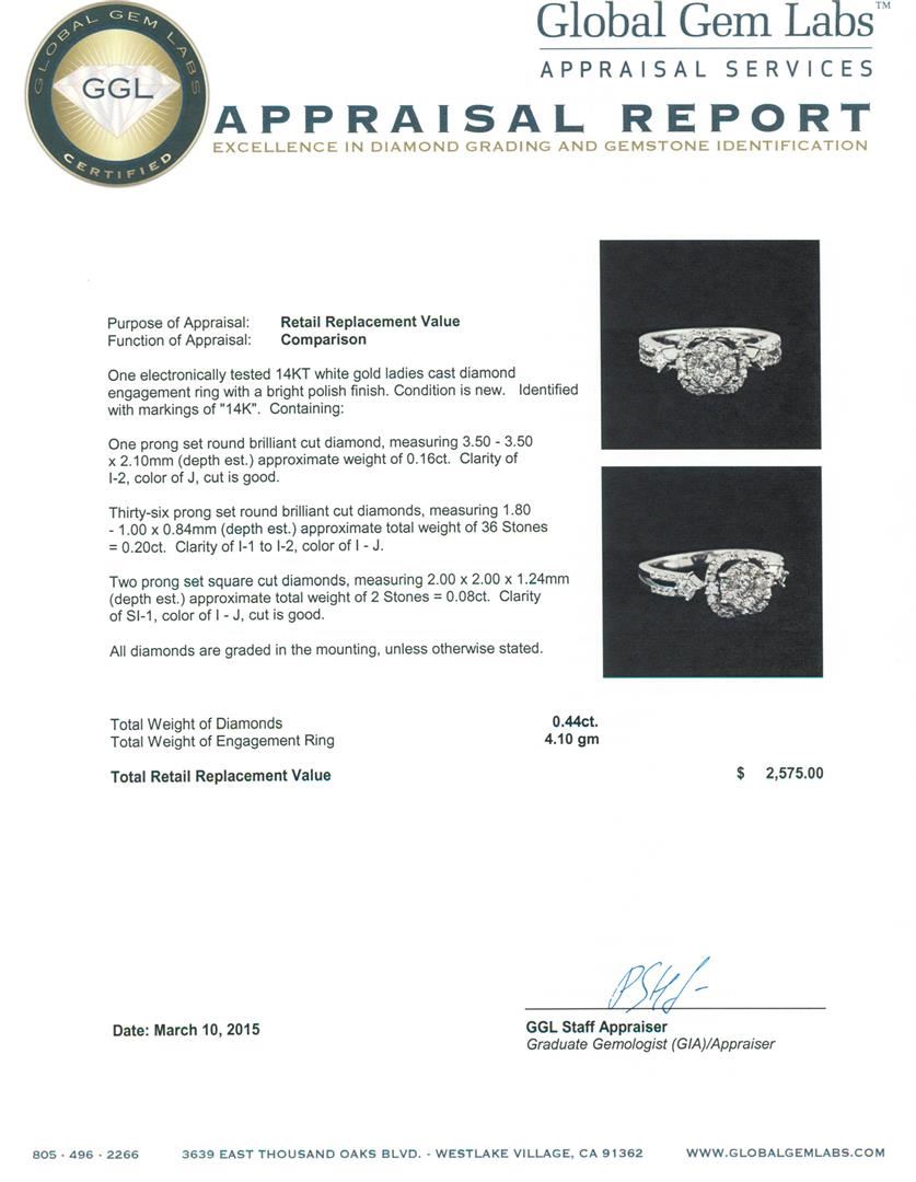 One electronically tested 14KT white gold ladies cast diamond engagement ring with a bright polish finish. Identified with markings of "14K". Condition is new. Containing: One prong set round brilliant cut diamond, measuring 3.50 - 3.50 x 2.10mm (depth est.) approximate weight of 0.16ct. Clarity: I-2. Color: J, Cut is Good. Thirty-Six prong set round brilliant cut diamonds, measuring 1.80 - 1.00 x 0.84mm (depth est.) approximate total weight of 36 Stones = 0.20 ct. Clarity: I-1 to I-2. Color: I - J. Two prong set square cut diamonds, measuring 2.00 x 2.00 x 1.24mm (depth est.) approximate total weight of 2 Stones = 0.08ct. Clarity: SI-1. Color: I - J, Cut is Good. All diamonds are graded in the mounting, unless otherwise stated. Total Weight of Diamonds 0.44ct. Total Weight of Engagement Ring 4.10 grams. GGL Appraised.