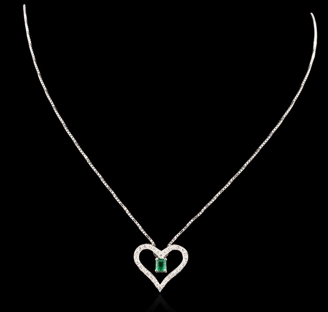 One electronically tested 14KT white gold ladies combination cast & assembled emerald and diamond heart pendant & chain 18.0" long, thin square box link with a lobster claw clasp with a bright polish finish. Condition is new. Containing: One prong set emerald modified step cut natural emerald, measuring 4.80 x 4.12 x 3.11mm, stated weight of 0.45ct., clarity is moderately included, type III, medium, moderately strong, green color, (GIA G 5/4), cut is good. Thirty prong set round brilliant cut diamonds, measuring 1.30 - 1.30 x 0.78mm (depth est.) approximate total weight of 30 Stones = 0.24ct. Clarity: I-1. Color: I - J, Cut is Good. All diamonds and colored gemstones are graded in the mounting, unless otherwise stated. Colored gemstones are presumed to have been subjected to commonly used enhancement processes. Total Weight of Colored Stones 0.45ct. Total Weight of Diamonds 0.24ct. Total Weight of Pendant & Chain 7.30 grams. GGL Appraised at $3,380.00.