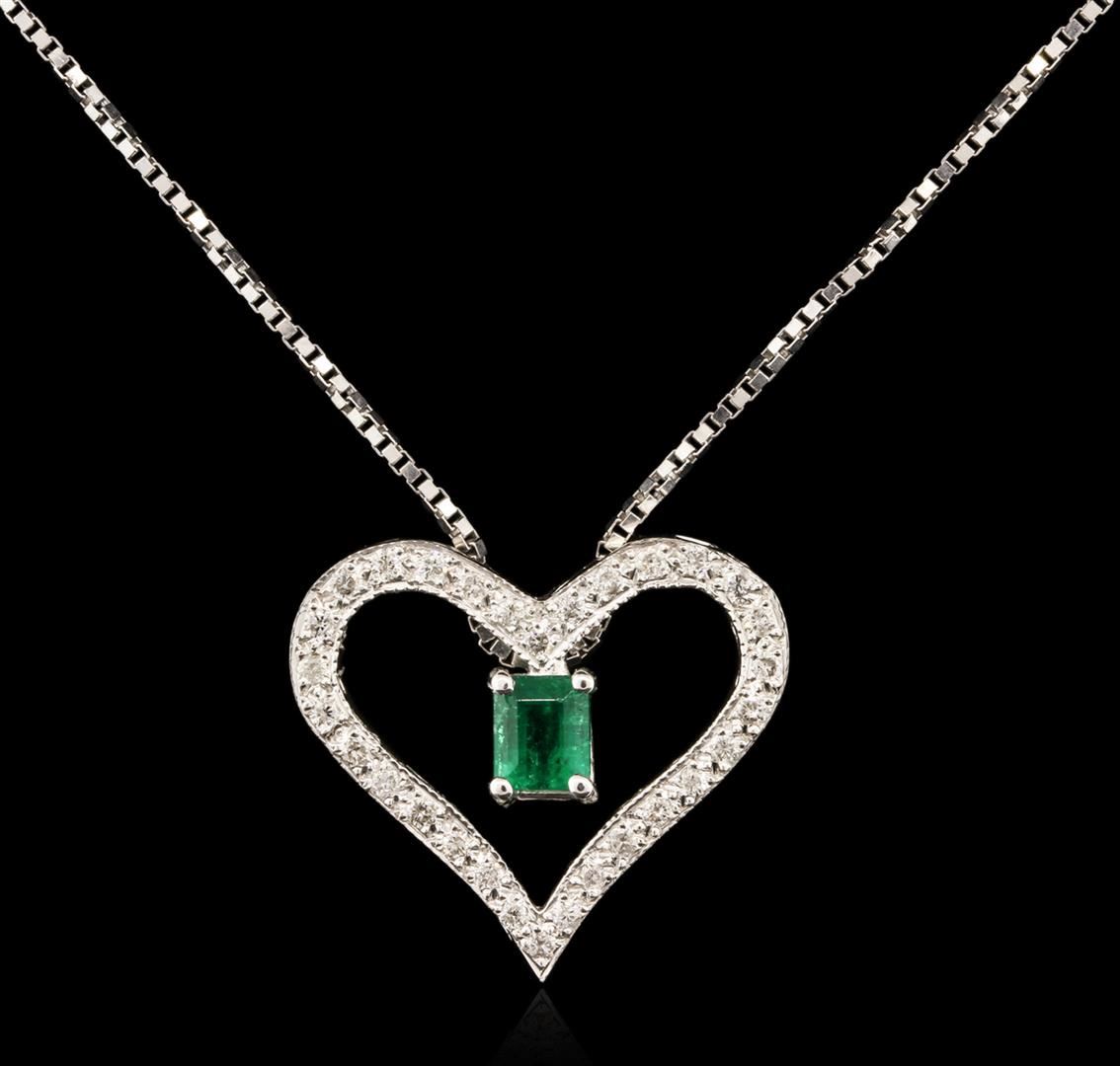 One electronically tested 14KT white gold ladies combination cast & assembled emerald and diamond heart pendant & chain 18.0" long, thin square box link with a lobster claw clasp with a bright polish finish. Condition is new. Containing: One prong set emerald modified step cut natural emerald, measuring 4.80 x 4.12 x 3.11mm, stated weight of 0.45ct., clarity is moderately included, type III, medium, moderately strong, green color, (GIA G 5/4), cut is good. Thirty prong set round brilliant cut diamonds, measuring 1.30 - 1.30 x 0.78mm (depth est.) approximate total weight of 30 Stones = 0.24ct. Clarity: I-1. Color: I - J, Cut is Good. All diamonds and colored gemstones are graded in the mounting, unless otherwise stated. Colored gemstones are presumed to have been subjected to commonly used enhancement processes. Total Weight of Colored Stones 0.45ct. Total Weight of Diamonds 0.24ct. Total Weight of Pendant & Chain 7.30 grams. GGL Appraised at $3,380.00.