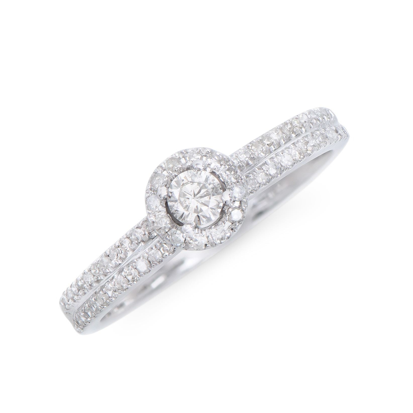 (1) round Diamond with a total weight of 0.15cts with a color of H-I and clarity of I1-I2. (68) round Diamonds with a total weight of 0.30cts with a color of H-I and clarity of I1-I2. Total weight of this ring is 2.4 grams. Ring size is 7.5.