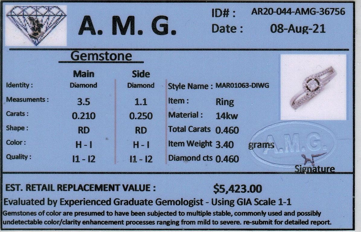 (1) round Diamond with a total weight of 0.21cts with a color of H-I and clarity of I1-I2. (35) round Diamonds with a total weight of 0.25cts with a color of H-I and clarity of I1-I2. Total weight of this ring is 3.4 grams. Ring size is 7.5.