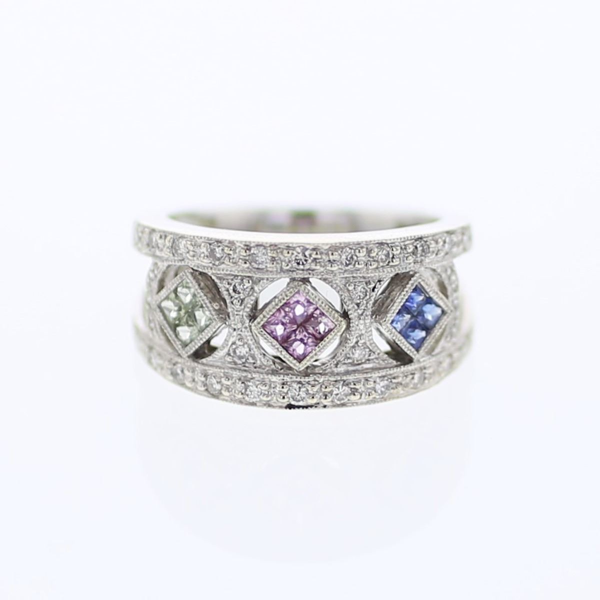 One 14KT White Gold 0.46ctw Multi Color Sapphire and Diamond Ring. (12) Multi Color Sapphires with a total weight of 0.46cts. (32) Diamonds with a total weight of 0.34cts. The total weight of this ring is 7.13 grams.
