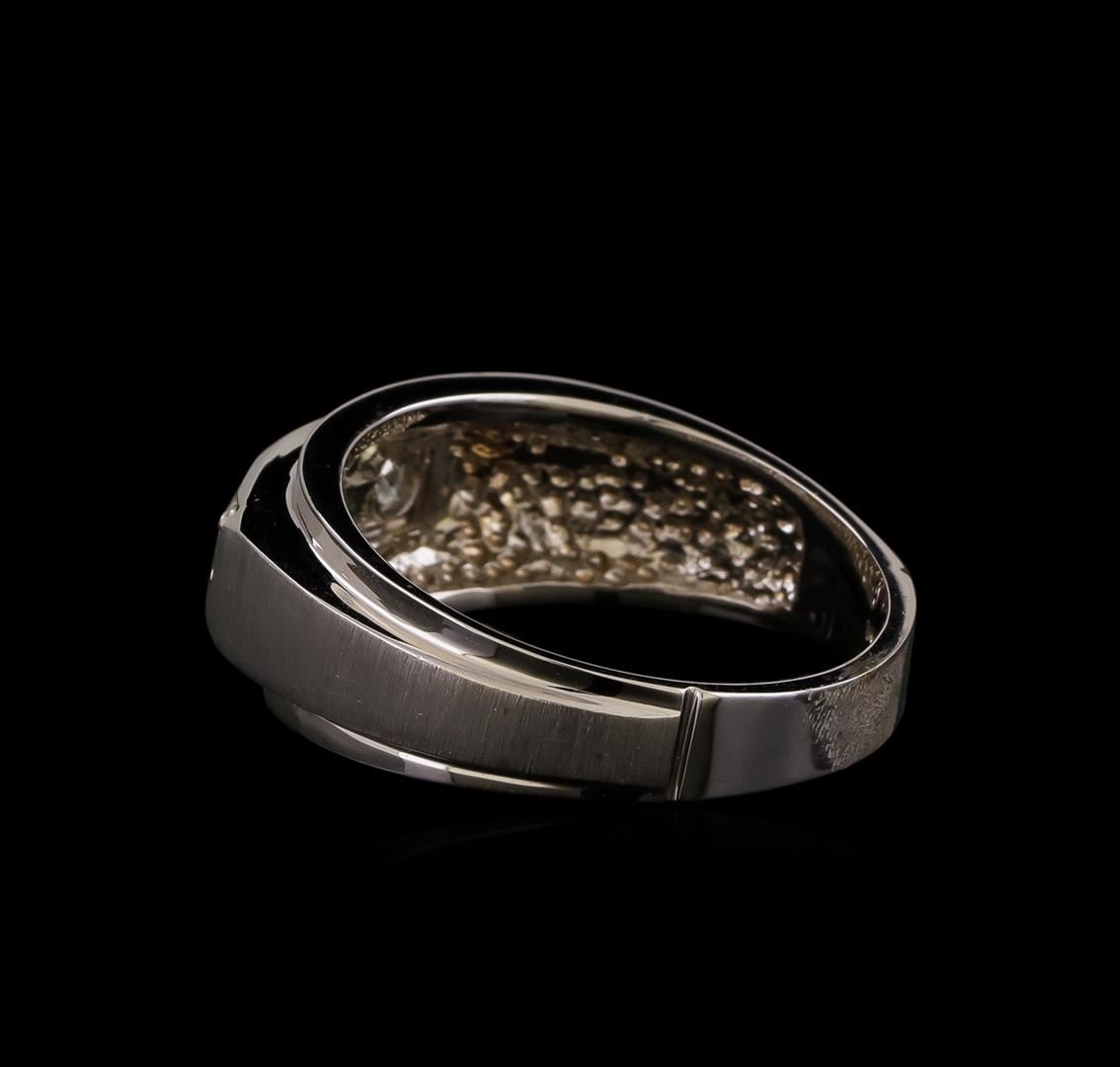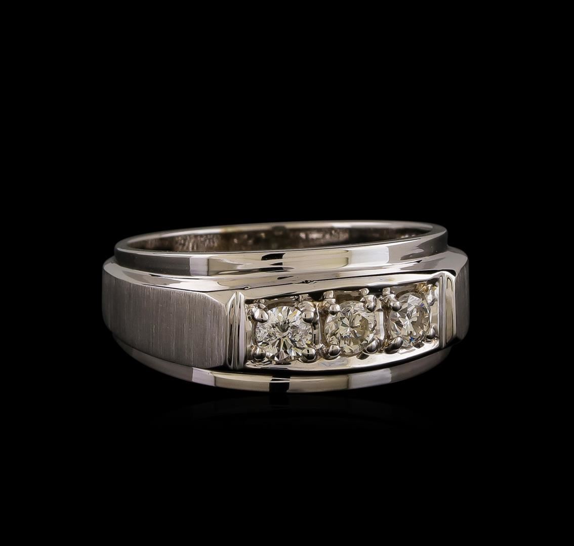 One electronically tested 14KT white gold mens combination cast & assembled diamond ring with a bright polish finish. Identified with markings of "14K". Condition is new. Containing: Three prong set round brilliant cut diamonds, measuring 3.50 - 3.50 x 2.10mm (depth est.) approximate total weight of 3 Stones = 0.47ct. Clarity: SI-2 to I-1. Color: J - K, Cut is Good. All diamonds are graded in the mounting, unless otherwise stated. Total Weight of Diamonds 0.47ct. Total Weight of Ring 7.10 grams. GGL Appraised at $3,555.00.