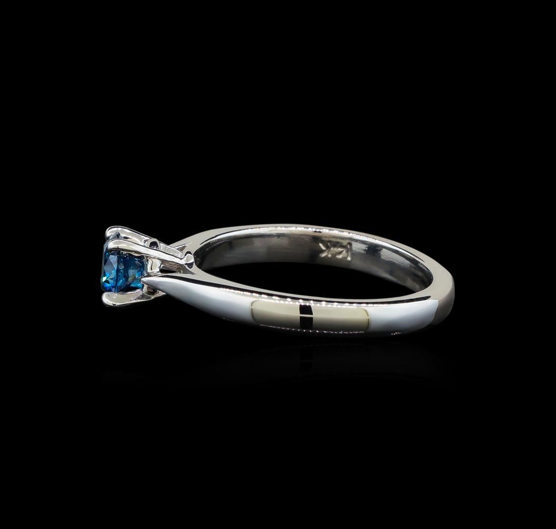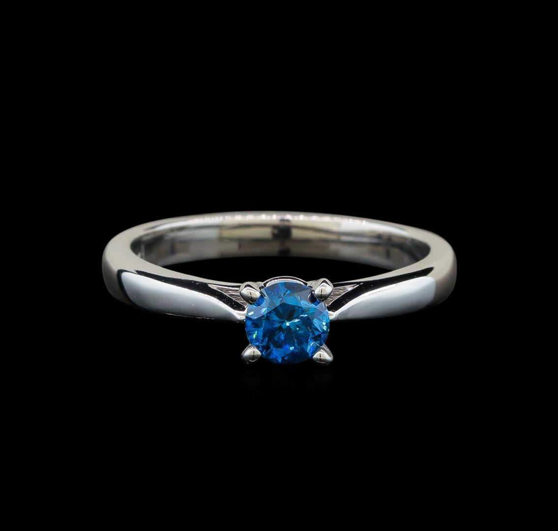 One electronically tested 14KT white gold ladies cast diamond solitaire ring with a cathedral shank with a bright polish finish. Identified with markings of "14K". Condition is new. Containing: One prong set round brilliant cut diamond, measuring 4.80 - 4.80 x 3.12mm (depth est.) exact weight 0.47ct. Clarity: I-1, Cut is Good. Color of the stone has been treated. Diamonds are graded in the mounting, unless otherwise stated. Total Weight of Diamonds 0.47ct. Total Weight of Solitaire Ring 3.40 grams. GGL Appraised at $1,335.00.