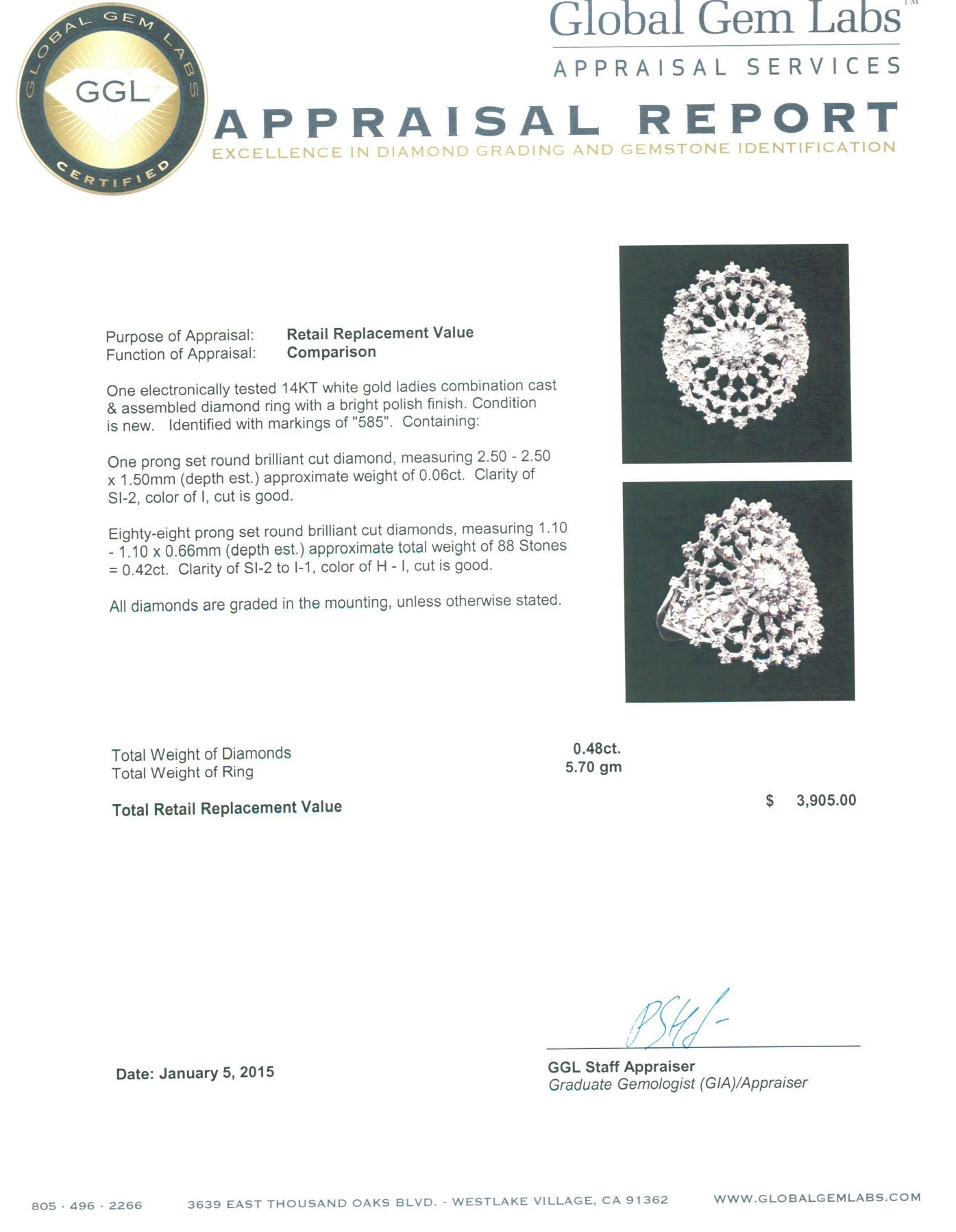One electronically tested 14KT white gold ladies combination cast & assembled diamond ring with a bright polish finish. Identified with markings of "585". Condition is new. Containing: One prong set round brilliant cut diamond, measuring 2.50 - 2.50 x 1.50mm (depth est.) approximate weight of 0.06ct. Clarity: SI-2. Color: I, Cut is Good. Eighty-Eight prong set round brilliant cut diamonds, measuring 1.10 - 1.10 x 0.66mm (depth est.) approximate total weight of 88 Stones = 0.42ct. Clarity: SI-2 to I-1. Color: H - I, Cut is Good. All diamonds are graded in the mounting, unless otherwise stated. Total Weight of Diamonds 0.48ct. Total Weight of Ring 5.70 grams. GGL Appraised.