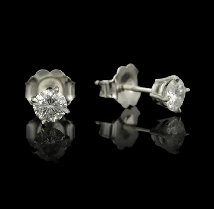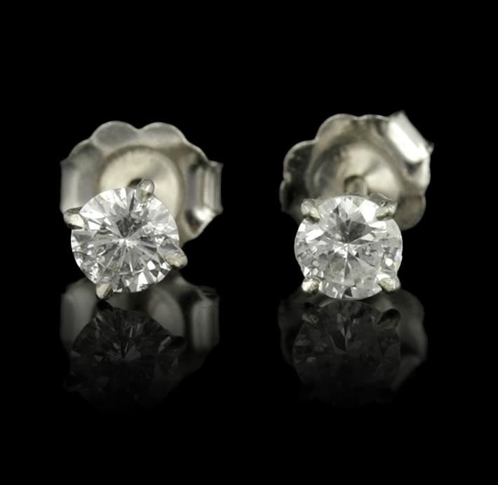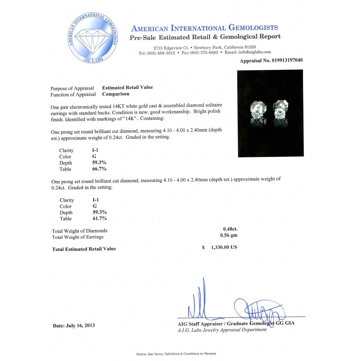 One pair electronically tested 14KT white gold cast & assembled diamond solitaire earrings with standard backs. Condition is new, good workmanship. Bright polish finish. Identified with markings of "14K". Containing: One prong set round brilliant cut diamond, measuring 4.10 - 4.00 x 2.40mm (depth est.) approximate weight of 0.24ct. Graded in the setting. Clarity I-1. Color G. Depth 59.3%. Table 66.7%. One prong set round brilliant cut diamond, measuring 4.10 - 4.00 x 2.40mm (depth est.) approximate weight of 0.24ct. Graded in the setting. Clarity I-1. Color G. Depth 59.3%. Table 61.7%. Total Weight of Diamonds 0.48ct. Total Weight of Earrings 0.56gm. AIG Appraised at $1,330.00.
