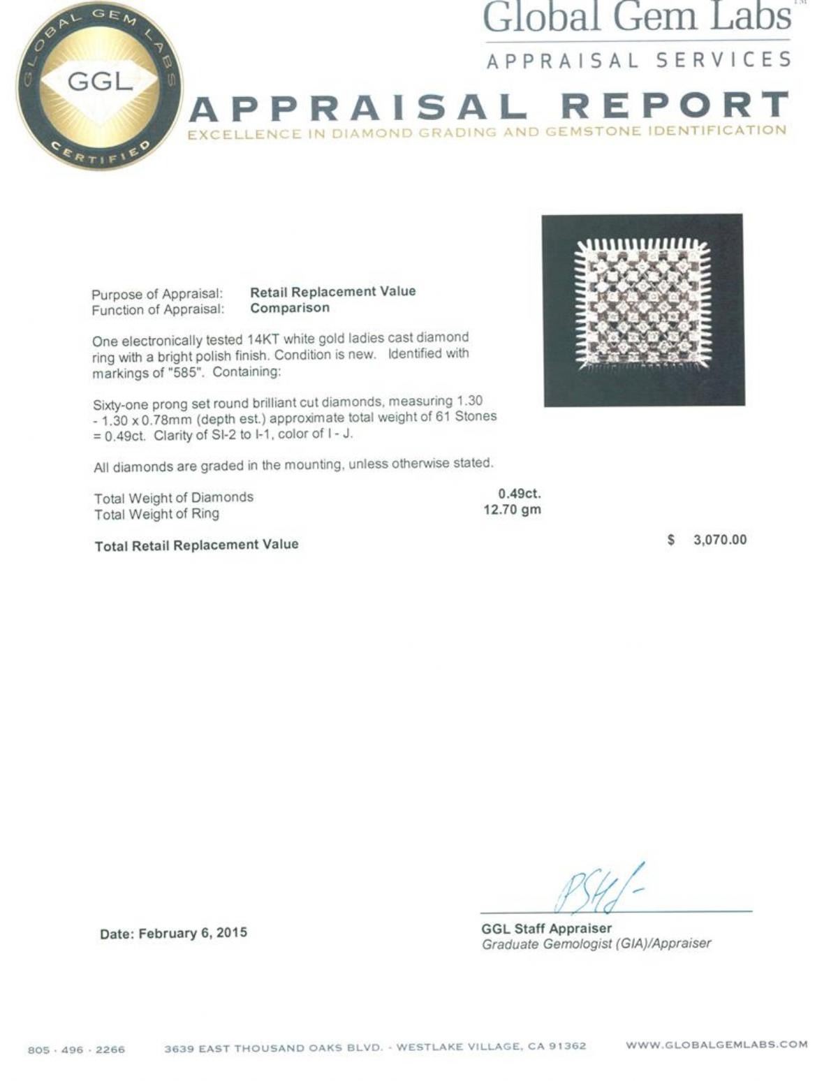 One electronically tested 14KT white gold ladies cast diamond ring with a bright polish finish. Identified with markings of "585". Condition is new. Containing: Sixty-One prong set round brilliant cut diamonds, measuring 1.30 - 1.30 x 0.78mm (depth est.) approximate total weight of 61 Stones = 0.49ct. Clarity: SI-2 to I-1. Color: I - J. All diamonds are graded in the mounting, unless otherwise stated. Total Weight of Diamonds 0.49ct. Total Weight of Ring 12.70 grams. GGL Appraised.