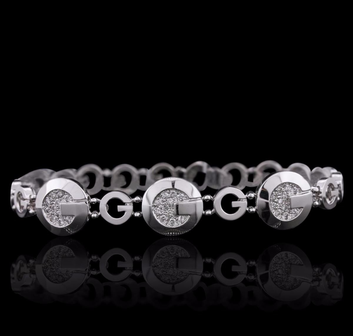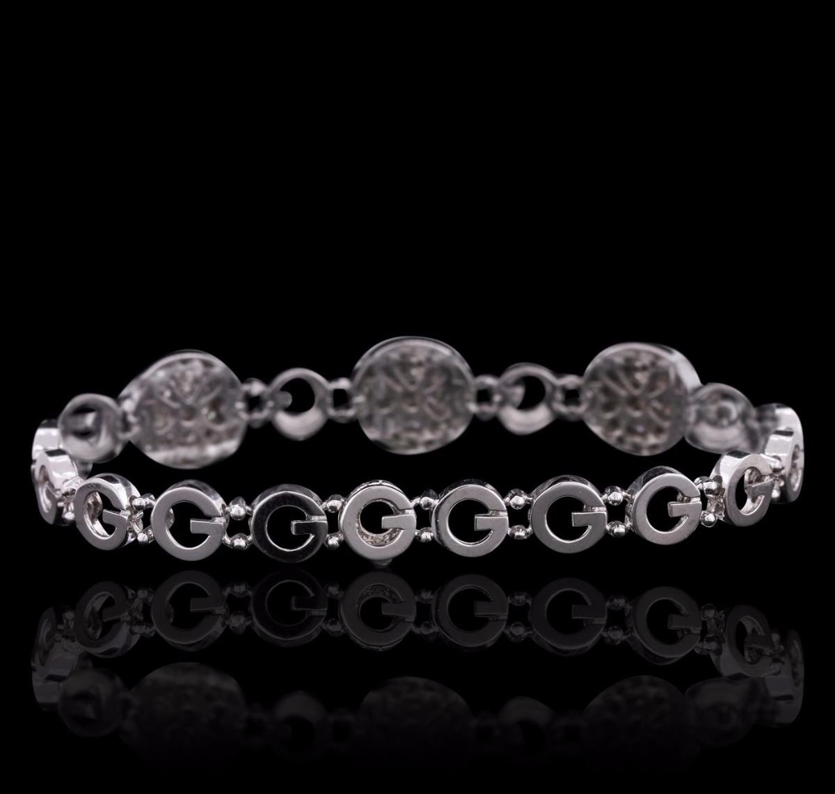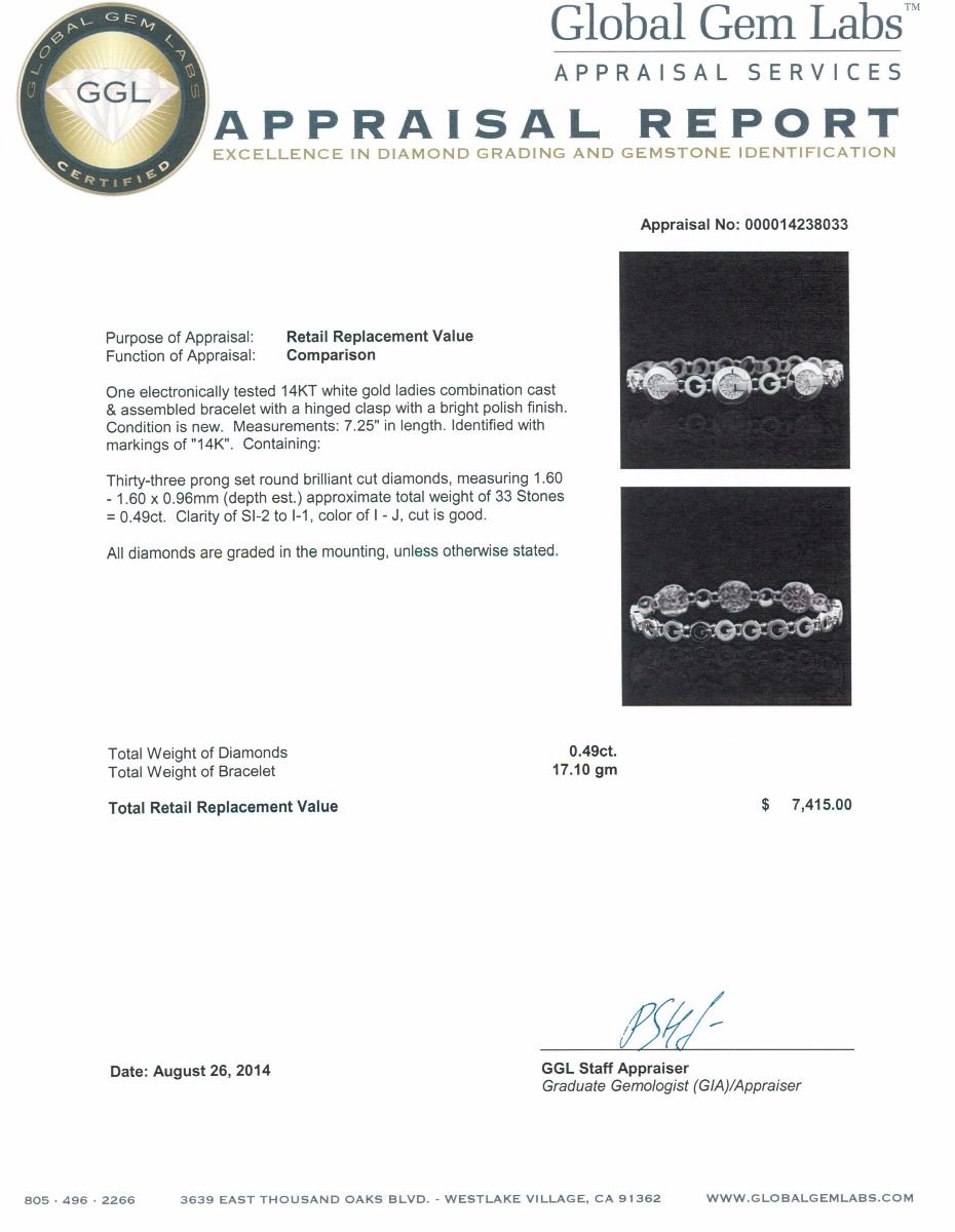 One electronically tested 14KT white gold ladies combination cast & assembled bracelet with a hinged clasp with a bright polish finish. Measurements: 7.25" in length. Identified with markings of "14K". Condition is new. Containing: Thirty-Three prong set round brilliant cut diamonds, measuring 1.60 - 1.60 x 0.96mm (depth est.) approximate total weight of 33 Stones = 0.49ct. Clarity: SI-2 to I-1. Color: I - J, Cut is Good. All diamonds are graded in the mounting, unless otherwise stated. Total Weight of Diamonds 0.49ct. Total Weight of Bracelet 17.10 grams. GGL Appraised at $7,415.00.