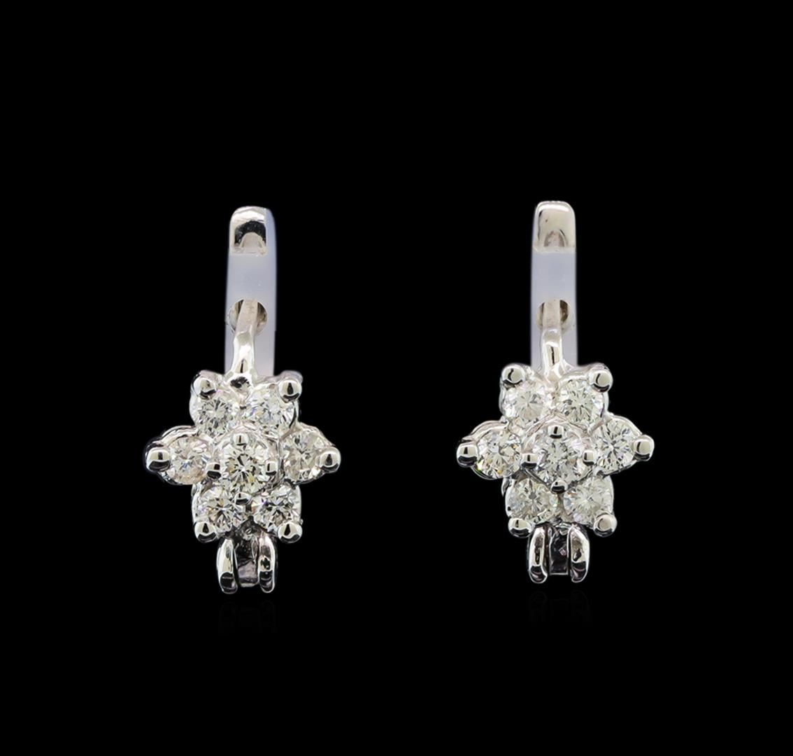 One pair electronically tested 14KT white gold ladies cast diamond earrings with hinged clip backs with a bright polish finish. Identified with markings of "14K". Condition is new. Containing: Fourteen prong set round brilliant cut diamonds, measuring 2.50 - 2.00 x 1.35mm (depth est.) approximate total weight of 14 Stones = 0.50ct. Clarity: SI-1 to SI-2. Color: J - K, Cut is Good. All diamonds are graded in the mounting, unless otherwise stated. Total Weight of Diamonds 0.50ct. Total Weight of Earrings 3.40 grams. GGL Appraised at $1,830.00.