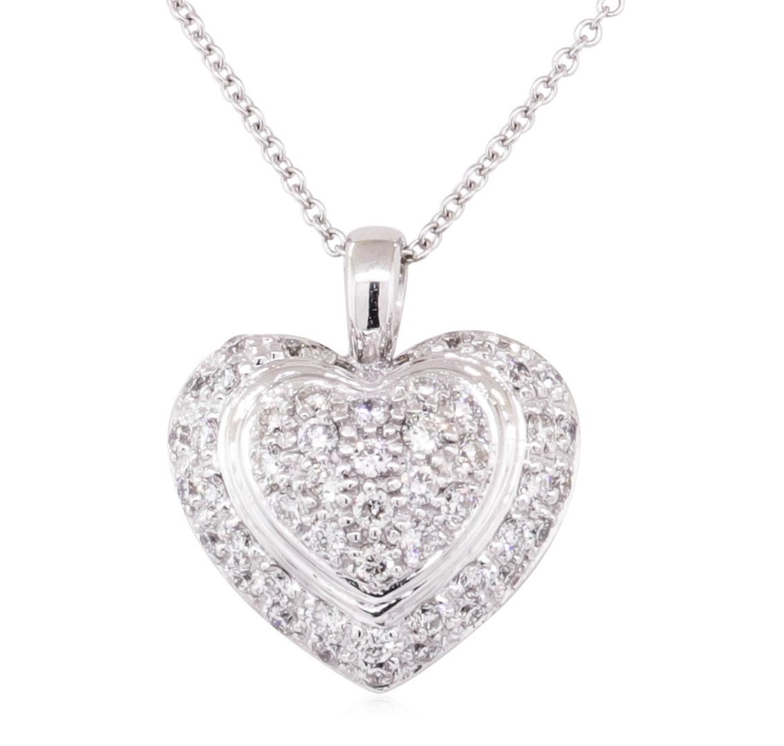 One heart shaped pendant with a sixteen inch long 1mm rounded cable link chain featuring: 14KT white gold weighing 4.5 grams containing diamonds weighing 0.50ctw.