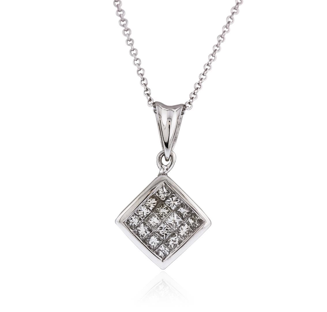 One pendant with chain featuring: 14KT white gold weighing 2.90 grams containing diamonds with a total weight of 0.50ct.