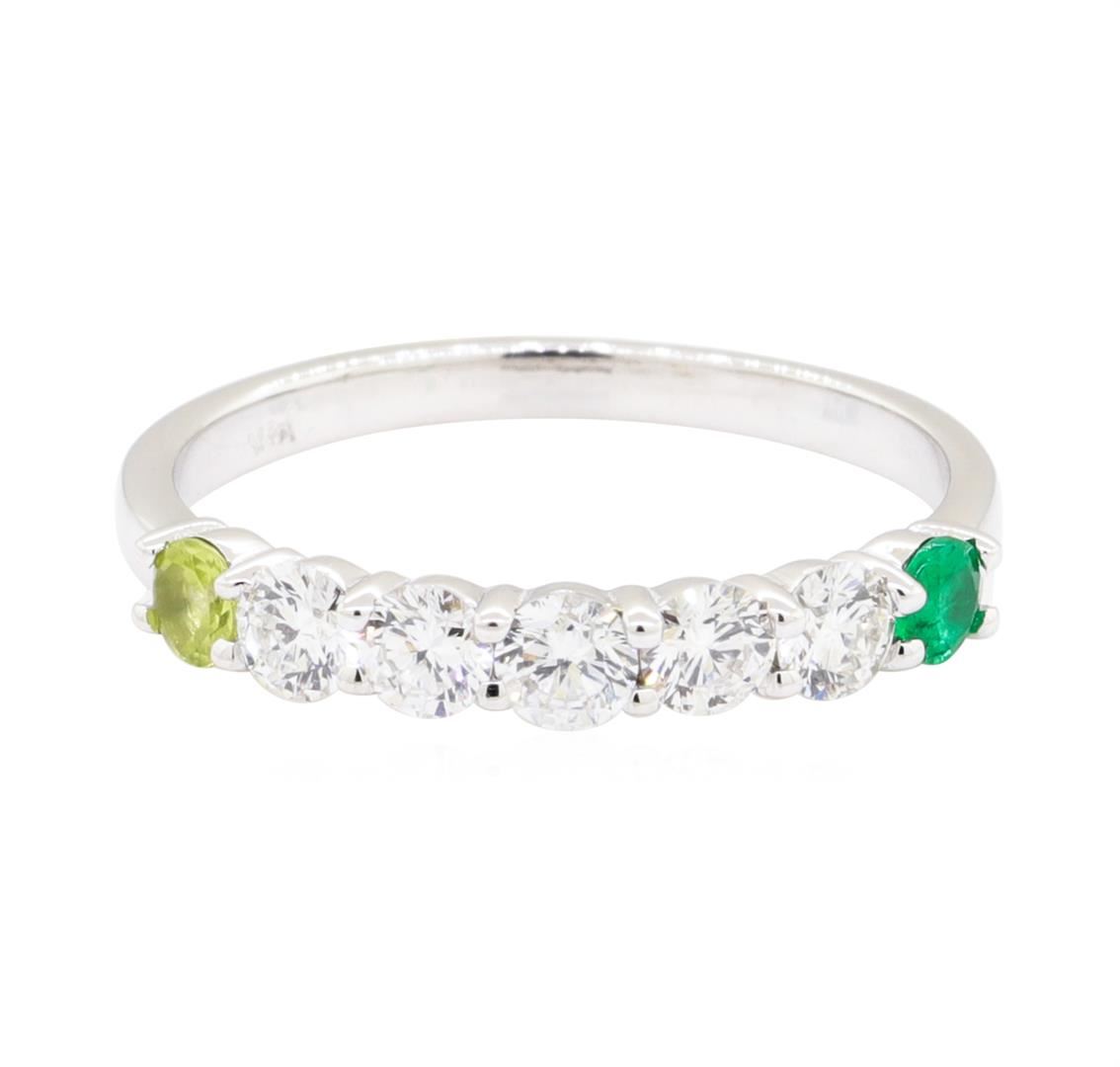 One ring featuring: 14KT white gold weighing 1.8 grams containing one peridot weighing 0.10ct, one emerald weighing 0.10ct, and diamonds weighing 0.50ctw. The ring is a size 6.