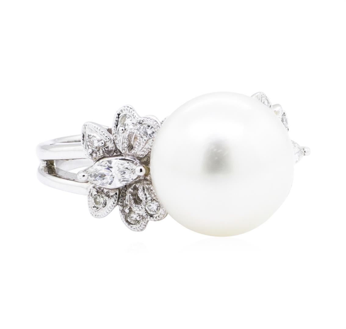 One ring featuring: 14KT white gold weighing 6.6 grams containing one freshwater button pearl measuring 11.5mm and diamonds weighing 0.50ctw. The ring is a size 6.