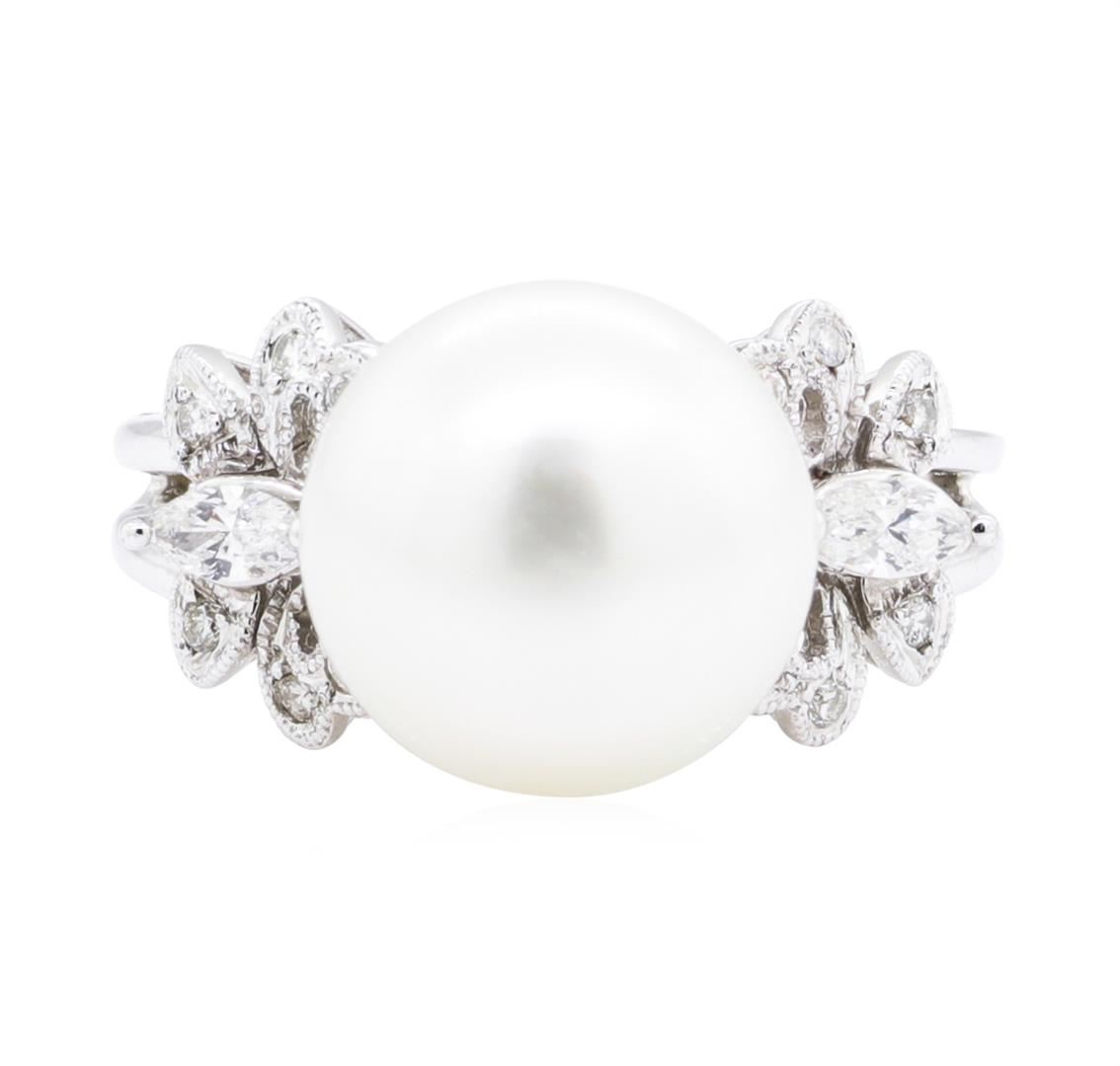 One ring featuring: 14KT white gold weighing 6.6 grams containing one freshwater button pearl measuring 11.5mm and diamonds weighing 0.50ctw. The ring is a size 6.
