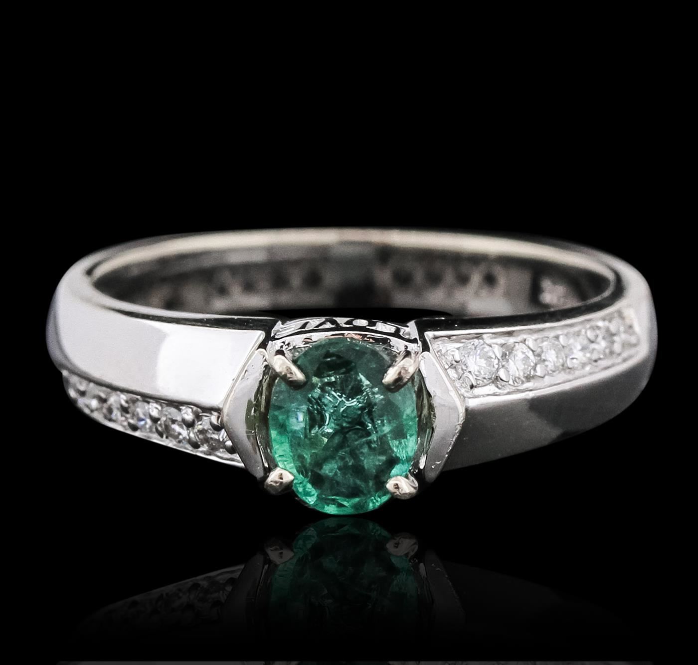 One electronically tested 14KT white gold ladies combination cast & assembled ring with a bright polish finish. Identified with markings of "14K". Condition is new. Containing: One prong set oval modified brilliant cut natural emerald, measuring 5.86 x 4.91 x 3.19mm, approximate weight of 0.50ct., clarity is moderately included, type III, medium light, very slightly grayish, bluish green color, (GIA bG 4/3), cut is good. Twelve prong set round brilliant cut diamonds, measuring 1.30 - 1.30 x 0.78mm (depth est.) approximate total weight of 12 Stones = 0.10ct. Clarity: I-1 to I-2. Color: G - H, Cut is Good. Colored gemstones are presumed to have been subjected to commonly used enhancement processes. All diamonds and colored gemstones are graded in the mounting, unless otherwise stated. Total Weight of Colored Stones 0.50ct. Total Weight of Diamonds 0.10ct. Total Weight of Ring 4.20 grams. GGL Appraised at $2,735.00.