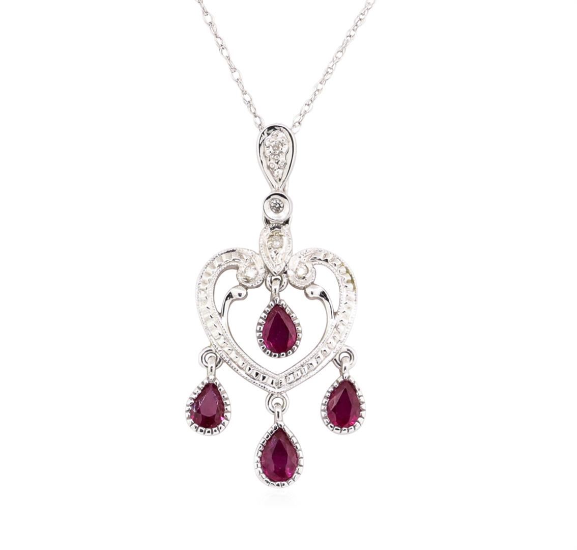 One heart shaped chandelier pendant with chain featuring: 14KT white gold weighing 2.3 grams containing rubies weighing 0.50ctw and diamonds weighing 0.05ctw. The loose rope chain measures approximately eighteen inches in length.