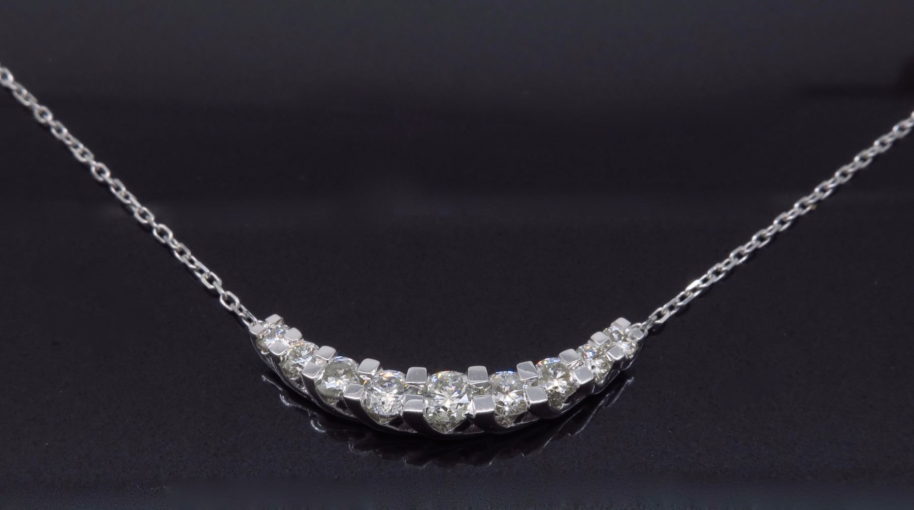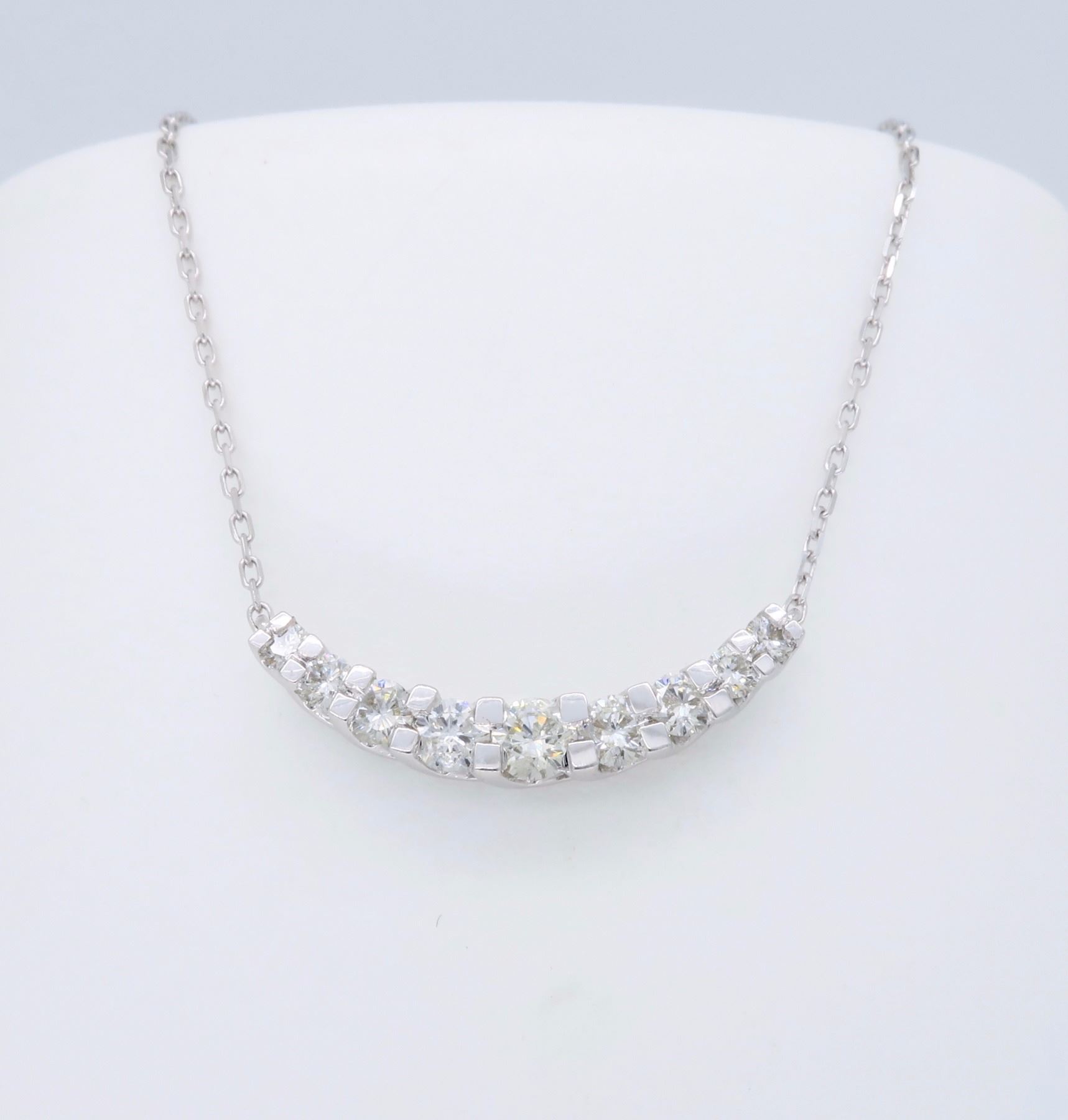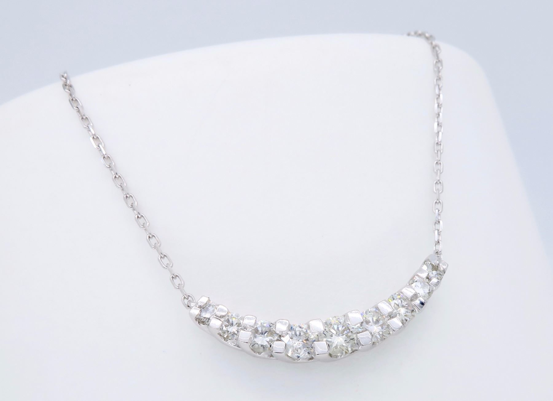 One 14KT White Gold 0.50ctw Diamond Pendant with Chain. Round Diamonds with a total weight of 0.50cts with a color of H and clarity of SI-2. Total weight of this pendant with chain is 2.07 grams. Total length of this chain is 17.5 inches.