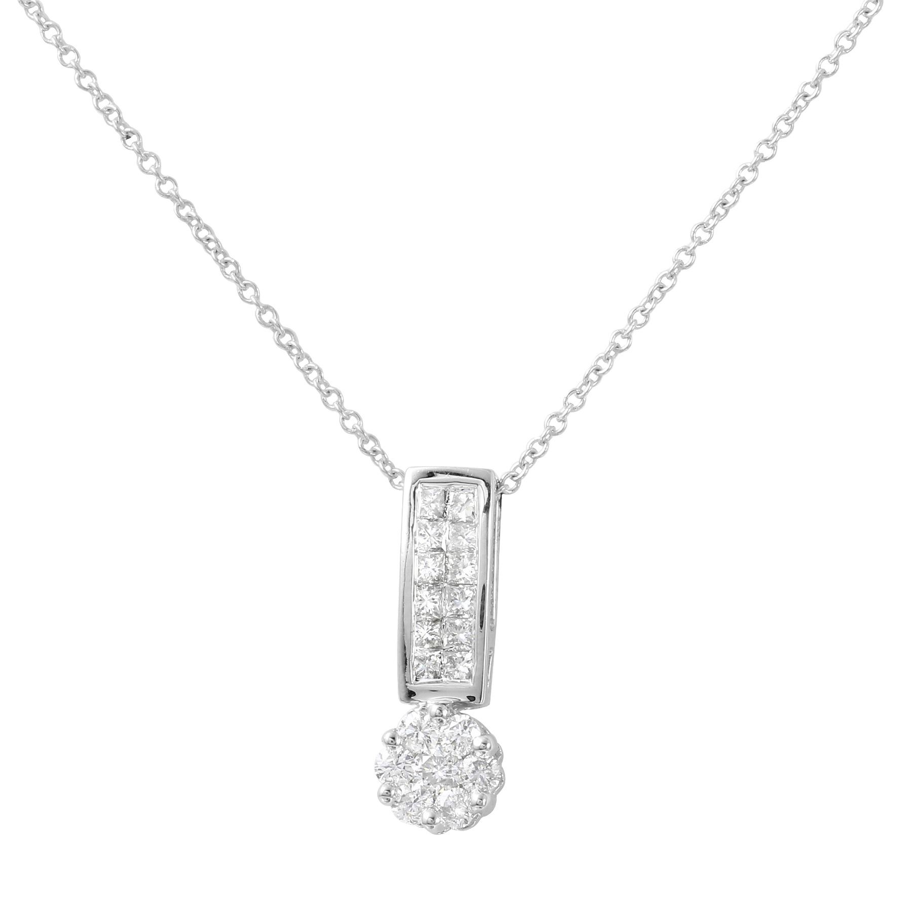 One 14KT White Gold 0.50ctw Diamond Pendant with Chain. (12) princess cut Diamonds with a total weight of 0.26cts with a color of I and clarity of I-1. (7) round Diamonds with a total weight of 0.24cts with a color of I and clarity of I-1. Total weight of this pendant with chain is 2.53 grams.