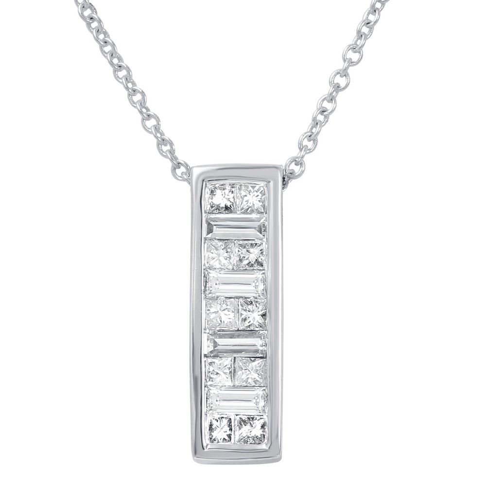One 14KT White Gold 0.50ctw Diamond Pendant with Chain. (4) Baguette Diamonds with a total weight of 0.26cts. (10) Diamonds with a total weight of 0.24cts. Total weight of this pendant with chain is 2.69 grams. Total weight of this pendant with chain is 2.69 grams.