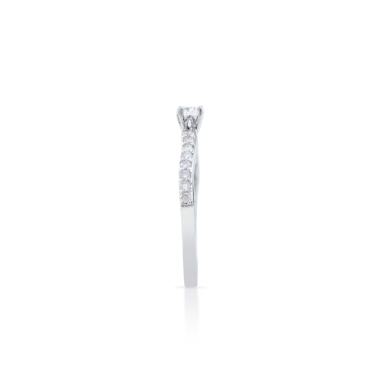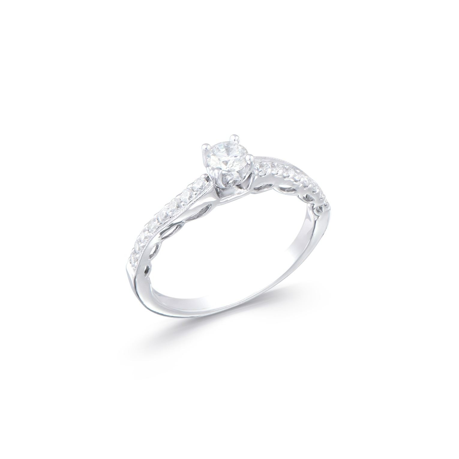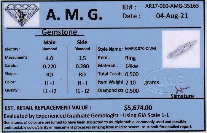 (1) round Diamond with a total weight of 0.22cts with a color of H-I and clarity of I1-I2. (16) round Diamonds with a total weight of 0.28cts with a color of H-I and clarity of I1-I2. Total weight of this ring is 2.1 grams. Ring size is 7.5.