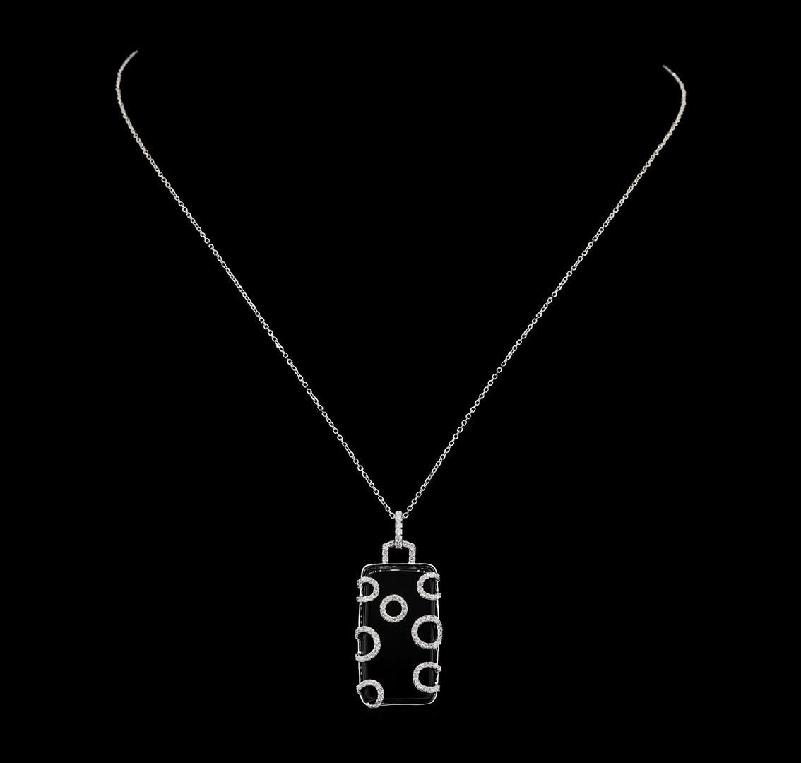 One lady's pendant and chain featuring: 14KT white gold weighing 6.8 grams containing one rectangular onyx and diamonds weighing 0.50ctw.