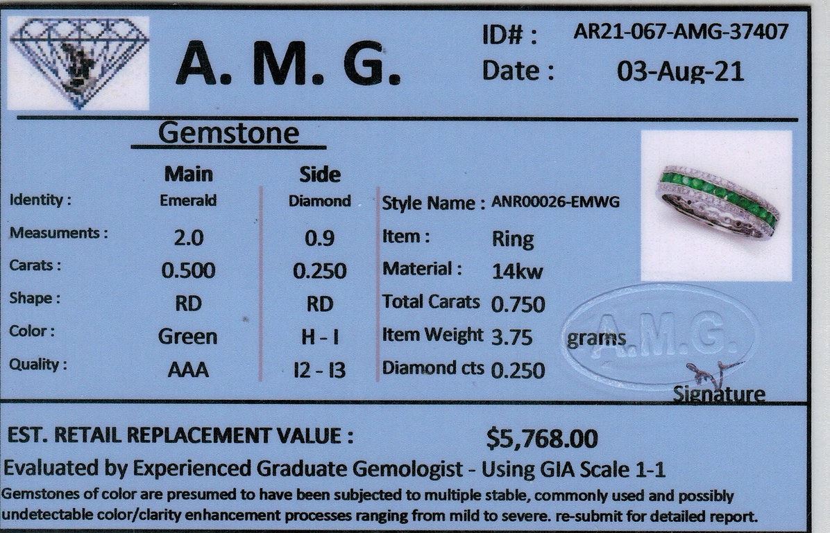 (13) Round Emeralds with a total weight of 0.50cts. (52) Round Diamonds with a total weight of 0.25cts with a clarity of I2-I3. Total weight of this ring is 3.75 grams. Ring size is 7.5.