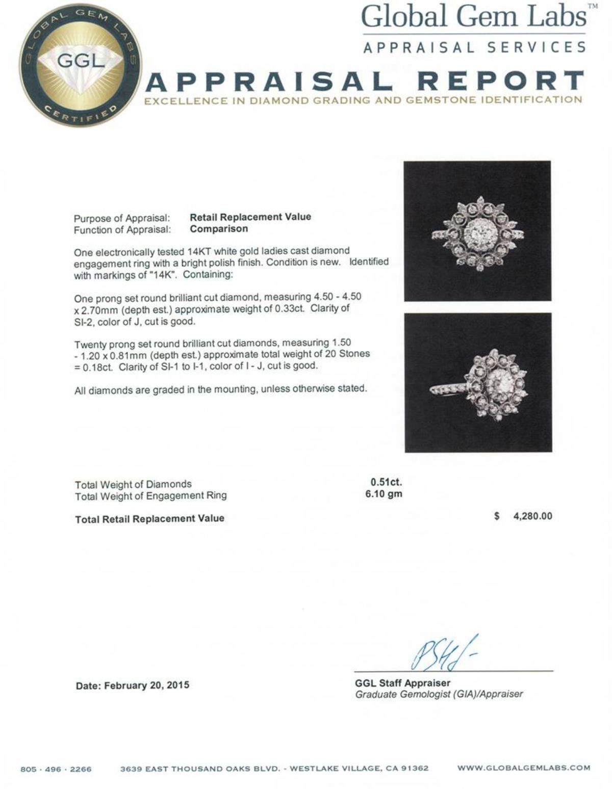 One electronically tested 14KT white gold ladies cast diamond engagement ring with a bright polish finish. Identified with markings of "14K". Condition is new. Containing: One prong set round brilliant cut diamond, measuring 4.50 - 4.50 x 2.70mm (depth est.) approximate weight of 0.33ct. Clarity: SI-2. Color: J, Cut is Good. Twenty prong set round brilliant cut diamonds, measuring 1.50 - 1.20 x 0.81mm (depth est.) approximate total weight of 20 Stones = 0.18ct. Clarity: SI-1 to I-1. Color: I - J, Cut is Good. All diamonds are graded in the mounting, unless otherwise stated. Total Weight of Diamonds 0.51ct. Total Weight of Engagement Ring 6.10 grams. GGL Appraised.