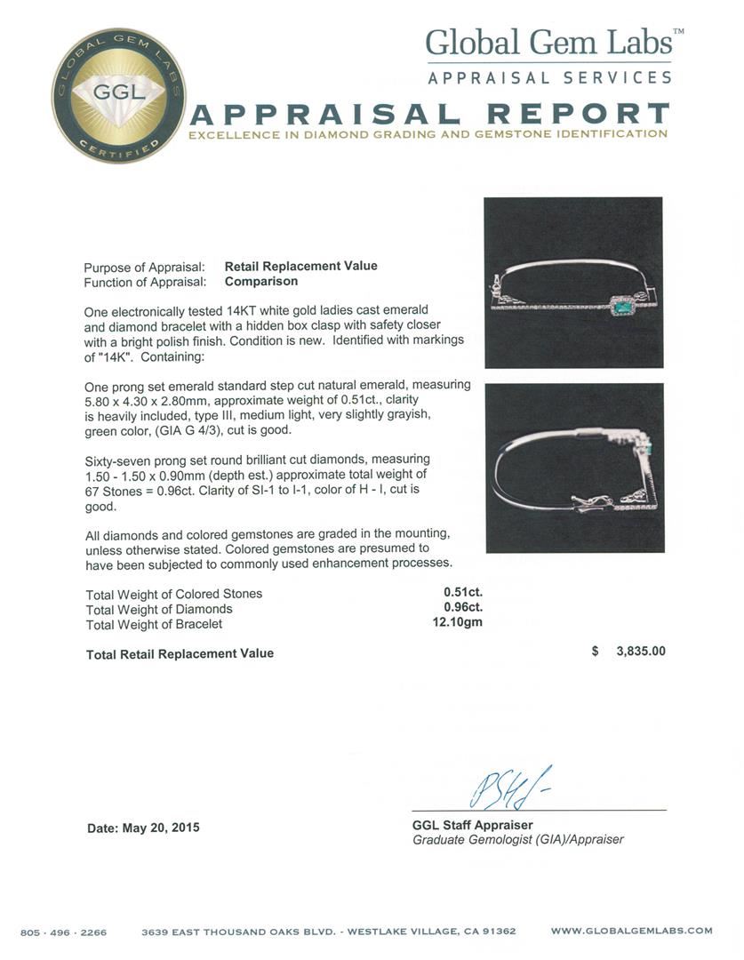 One electronically tested 14KT white gold ladies cast emerald and diamond bracelet with a hidden box clasp with safety closer with a bright polish finish. Identified with markings of "14K". Condition is new. Containing: One prong set emerald standard step cut natural emerald, measuring 5.80 x 4.30 x 2.80mm, approximate weight of 0.51ct., clarity is heavily included, type III, medium light, very slightly grayish, green color, (GIA G 4/3), cut is good. Sixty-Seven prong set round brilliant cut diamonds, measuring 1.50 - 1.50 x 0.90mm (depth est.) approximate total weight of 67 Stones = 0.96ct. Clarity: SI-1 to I-1. Color: H - I, Cut is Good. All diamonds and colored gemstones are graded in the mounting, unless otherwise stated. Colored gemstones are presumed to have been subjected to commonly used enhancement processes. Total Weight of Colored Stones 0.51ct. Total Weight of Diamonds 0.96ct. Total Weight of Bracelet 12.10 grams. GGL Appraised at $3,835.00.