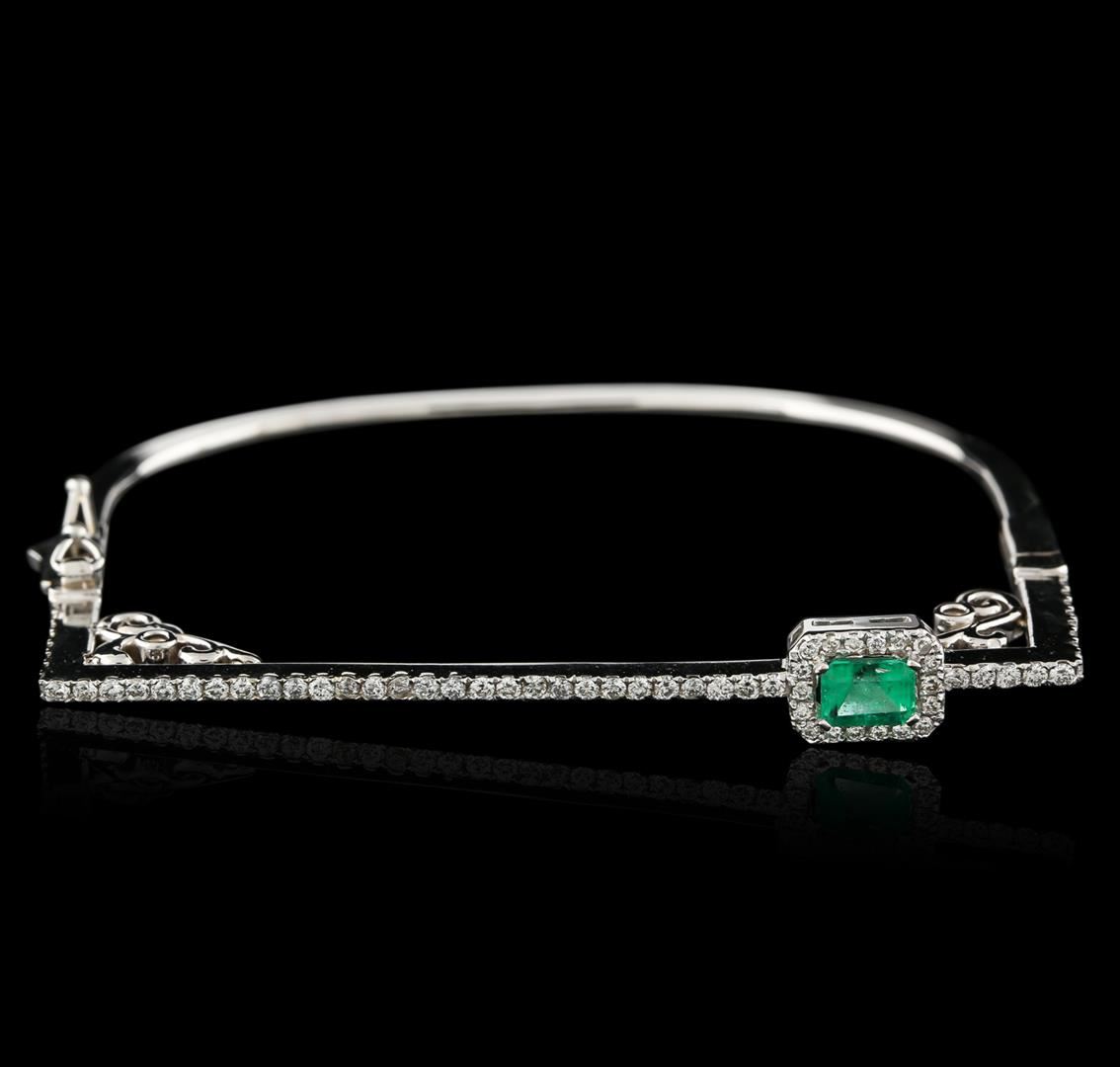 One electronically tested 14KT white gold ladies cast emerald and diamond bracelet with a hidden box clasp with safety closer with a bright polish finish. Identified with markings of "14K". Condition is new. Containing: One prong set emerald standard step cut natural emerald, measuring 5.80 x 4.30 x 2.80mm, approximate weight of 0.51ct., clarity is heavily included, type III, medium light, very slightly grayish, green color, (GIA G 4/3), cut is good. Sixty-Seven prong set round brilliant cut diamonds, measuring 1.50 - 1.50 x 0.90mm (depth est.) approximate total weight of 67 Stones = 0.96ct. Clarity: SI-1 to I-1. Color: H - I, Cut is Good. All diamonds and colored gemstones are graded in the mounting, unless otherwise stated. Colored gemstones are presumed to have been subjected to commonly used enhancement processes. Total Weight of Colored Stones 0.51ct. Total Weight of Diamonds 0.96ct. Total Weight of Bracelet 12.10 grams. GGL Appraised at $3,835.00.