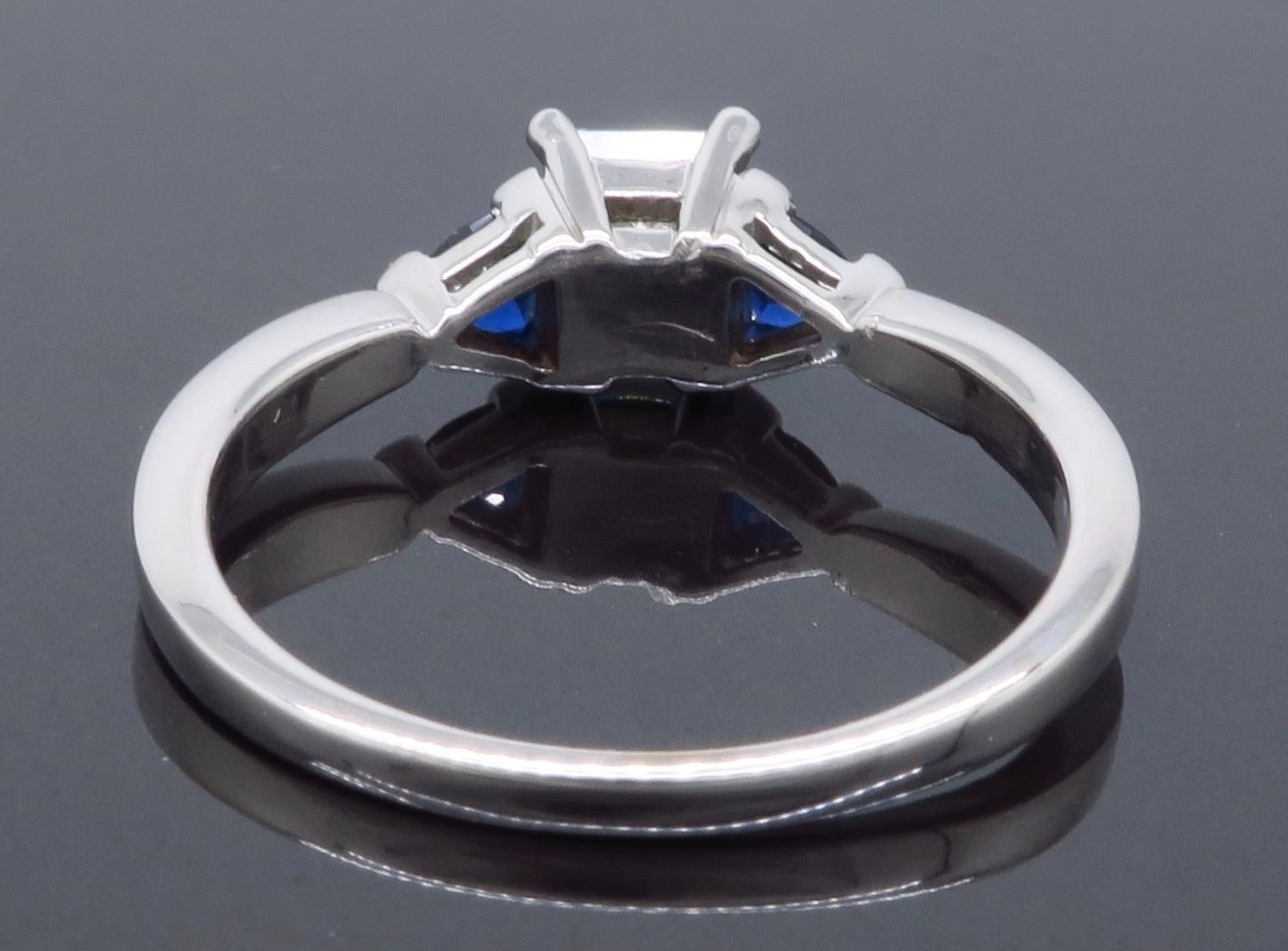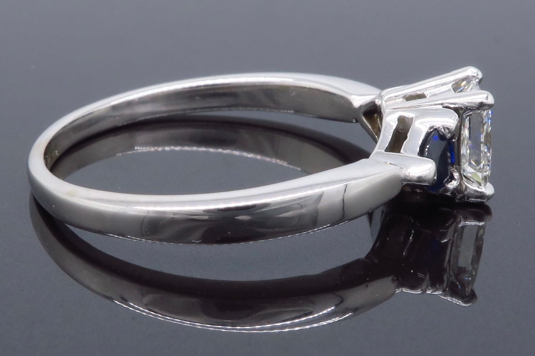 One 14KT White Gold 0.51ct GIA Cert Diamond and Sapphire Ring. (1) GIA certified Princess cut Diamond with a total weight of 0.51cts with a color of F and clarity of SI-1. (2) blue sapphires. Total weight of 2.8 grams.