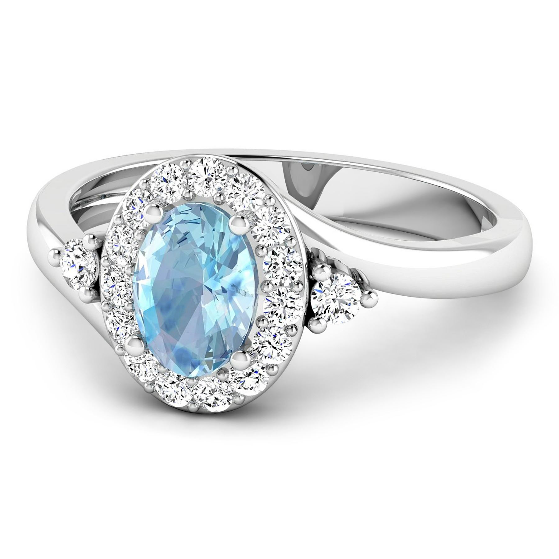 Aquamarine (AA+) Oval 7x5mm - 1Pc + White Diamond F/C Round 2.00mm - 2Pcs + White Diamond F/C Round 1.50mm - 15Pcs ( I1-I2/I color ) Total weight of gemstone is 0.51cts. Total Diamond weight is 0.27cts. Total weight of this ring is 2.57 grams. Ring size 7.