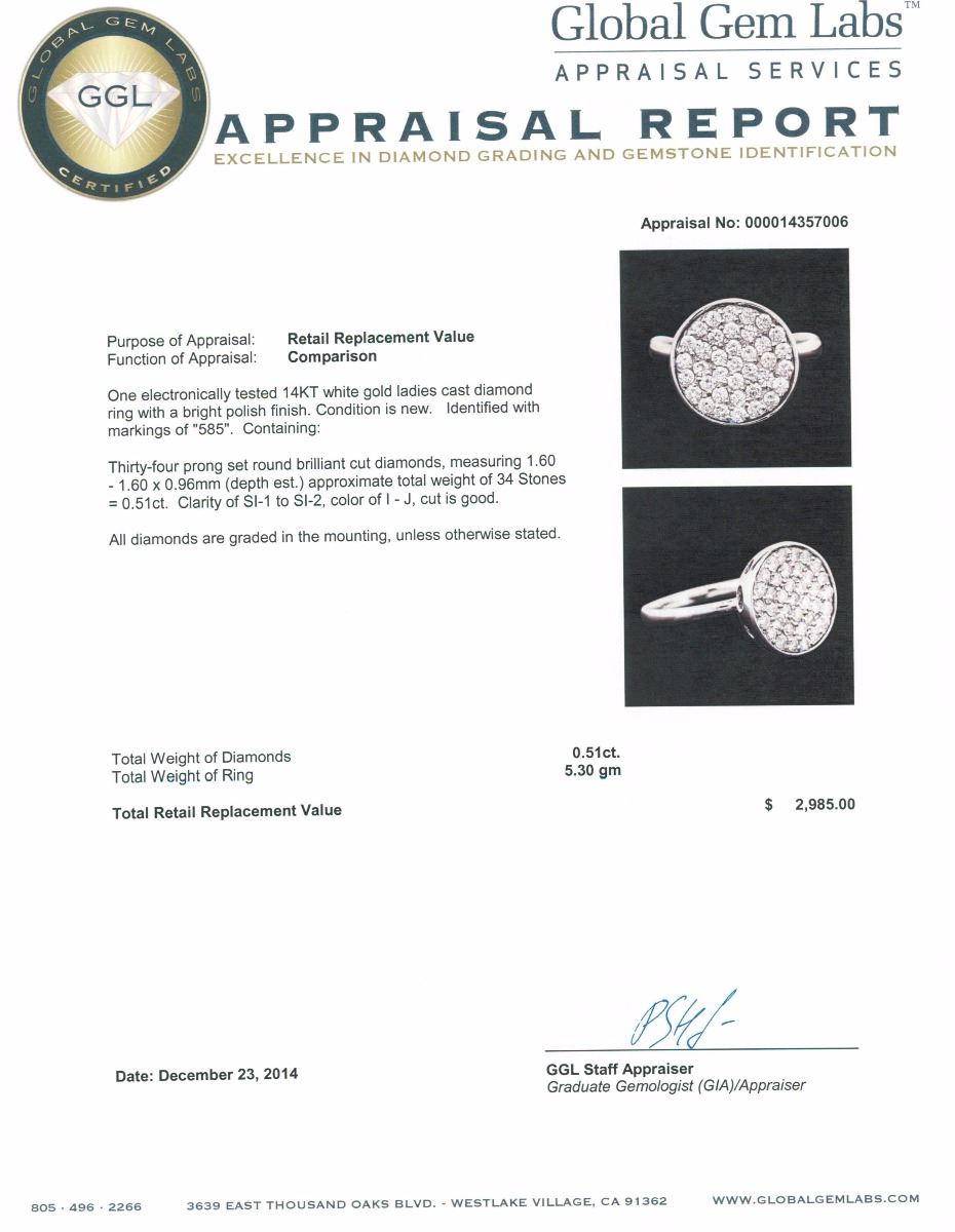 One electronically tested 14KT white gold ladies cast diamond ring with a bright polish finish. Identified with markings of "585". Condition is new. Containing: Thirty-Four prong set round brilliant cut diamonds, measuring 1.60 - 1.60 x 0.96mm (depth est.) approximate total weight of 34 Stones = 0.51ct. Clarity: SI-1 to SI-2. Color: I - J, Cut is Good. All diamonds are graded in the mounting, unless otherwise stated. Total Weight of Diamonds 0.51ct. Total Weight of Ring 5.30 grams. GGL Appraised at $2,985.00.