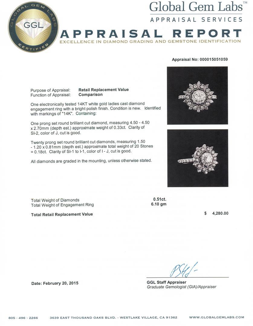 One electronically tested 14KT white gold ladies cast diamond engagement ring with a bright polish finish. Identified with markings of "14K". Condition is new. Containing: One prong set round brilliant cut diamond, measuring 4.50 - 4.50 x 2.70mm (depth est.) approximate weight of 0.33ct. Clarity: SI-2. Color: J, Cut is Good. Twenty prong set round brilliant cut diamonds, measuring 1.50 - 1.20 x 0.81mm (depth est.) approximate total weight of 20 Stones = 0.18ct. Clarity: SI-1 to I-1. Color: I - J, Cut is Good. All diamonds are graded in the mounting, unless otherwise stated. Total Weight of Diamonds 0.51ct. Total Weight of Engagement Ring 6.10 grams. GGL Appraised at $4,280.00.